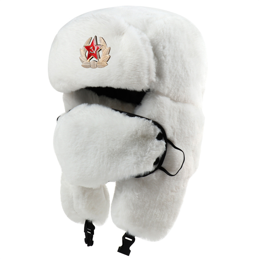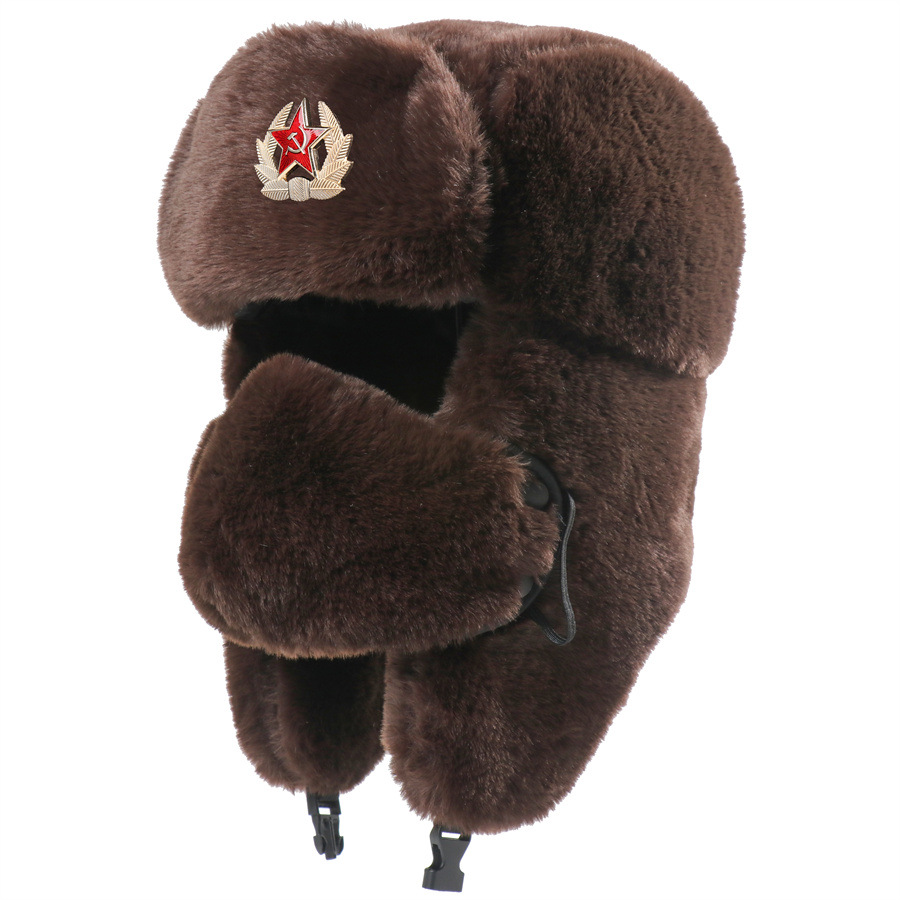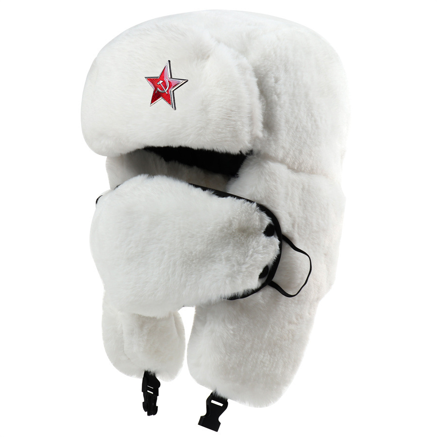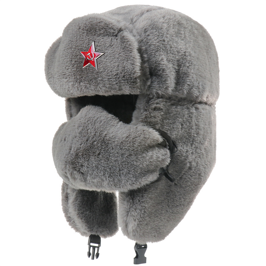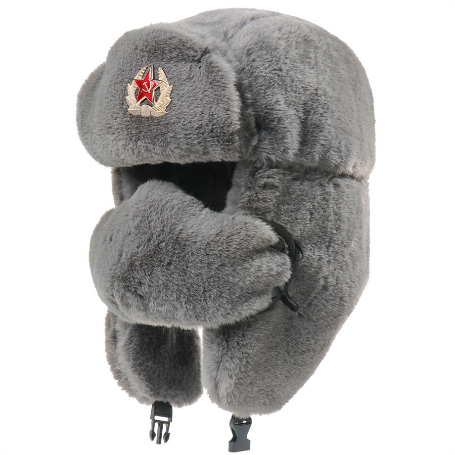소련 배지 Lei Feng Hat 남성과 여성의 모조 토끼 모피 야외 모자 귀 보호대 러시아 전체 머리 따뜻한 모자 방한 동북 모자