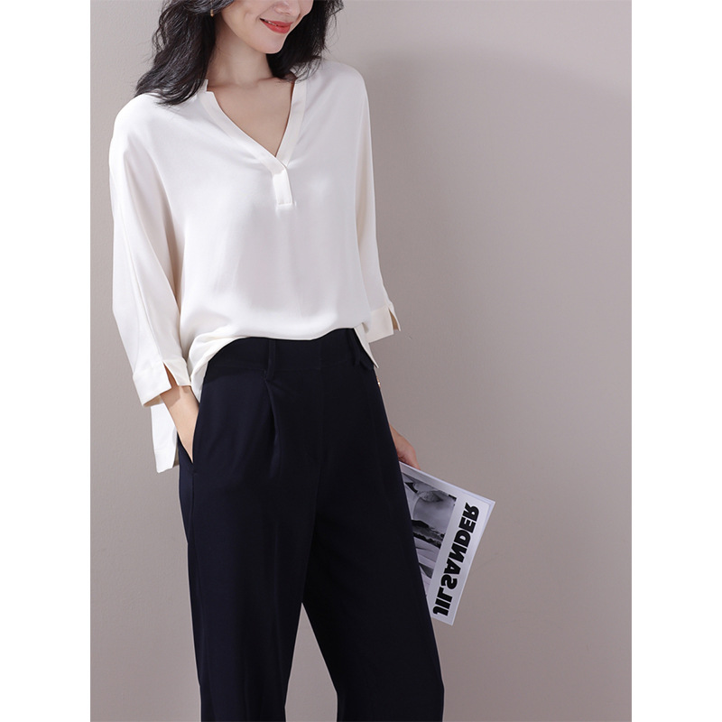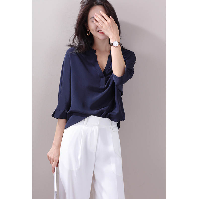 레트로 블루 브이넥 디자인 틈새 긴팔 편안한 셔츠 여성용 한국식 루즈한 페어리 탑스토어 가기