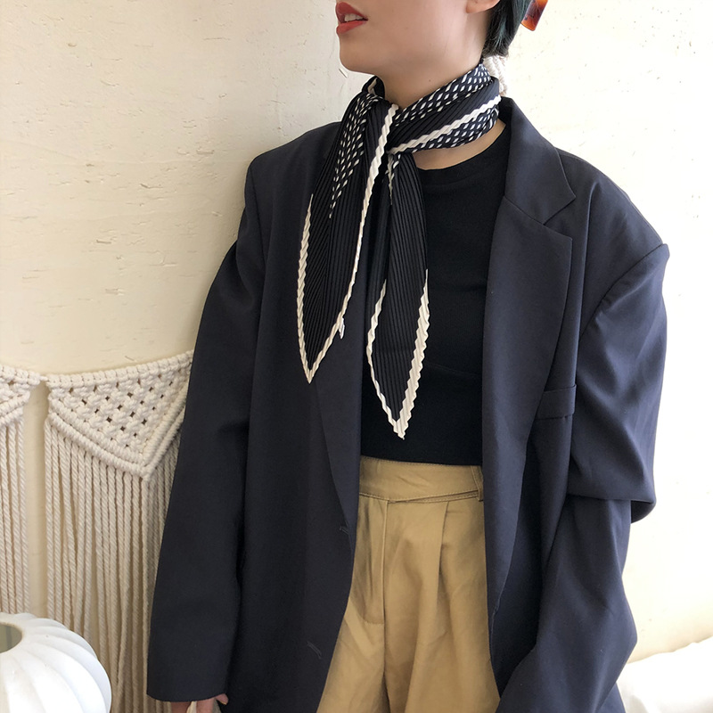 봄 가을 겨울 북유럽 심플 세련된 스타일 흑백 스트라이프 기하학적 주름 실크 주름 실크 스카프 여성용 헤어 벨트 스카프