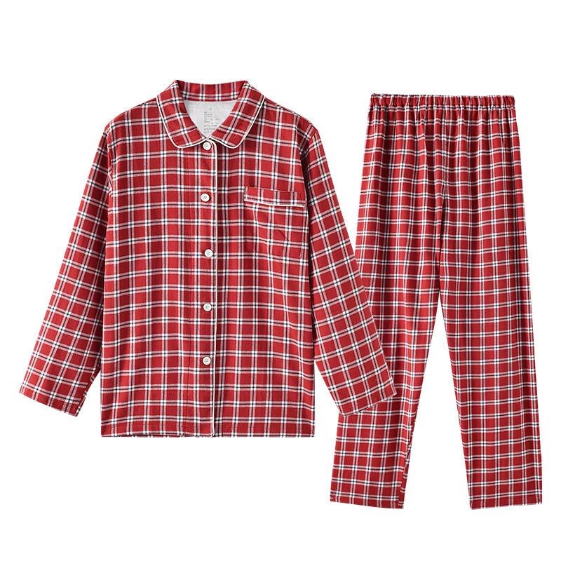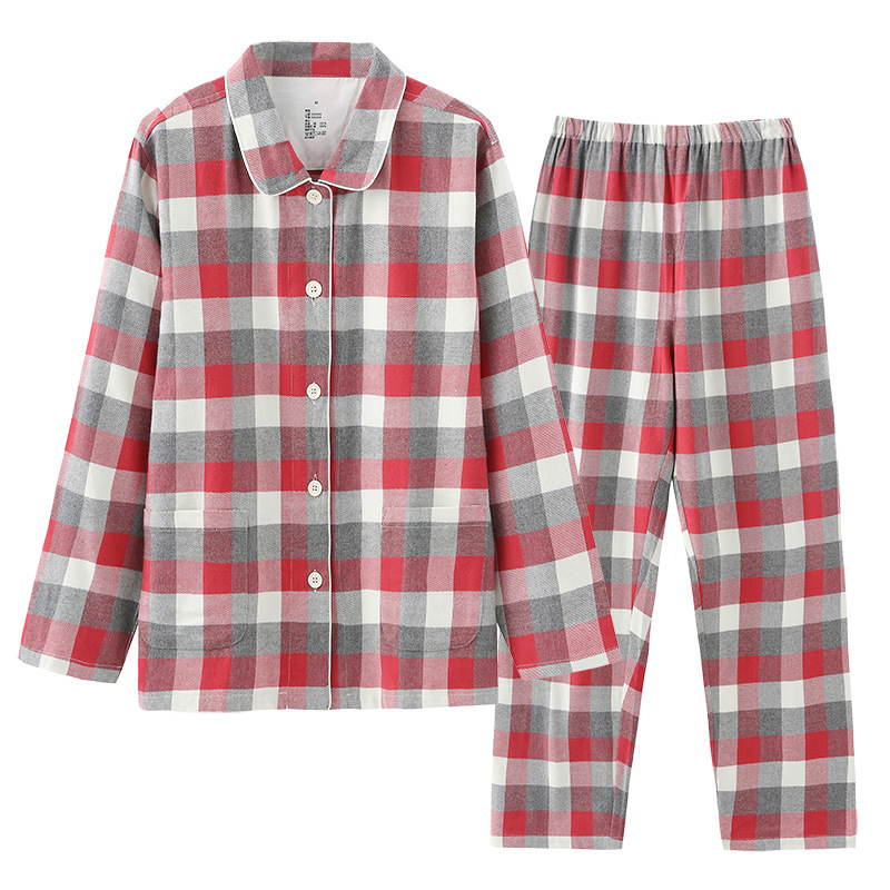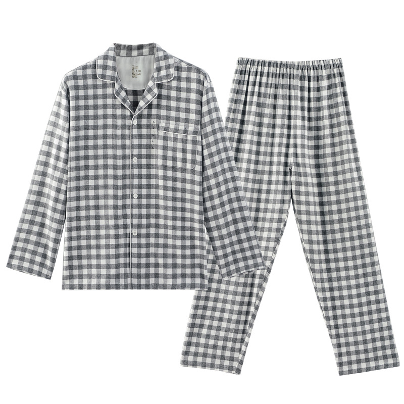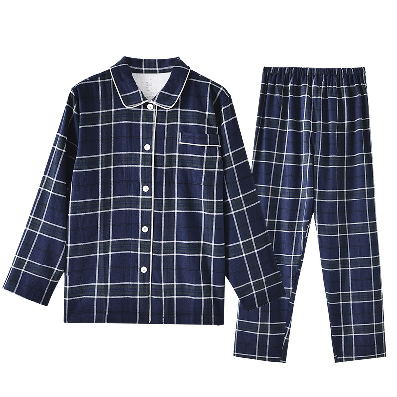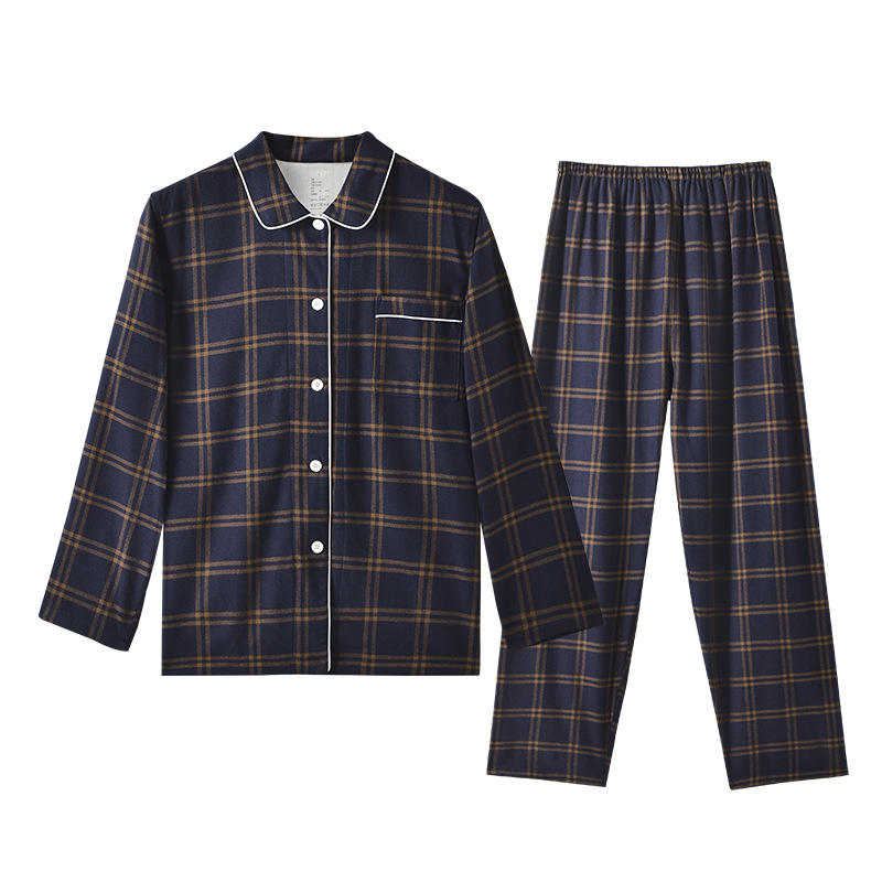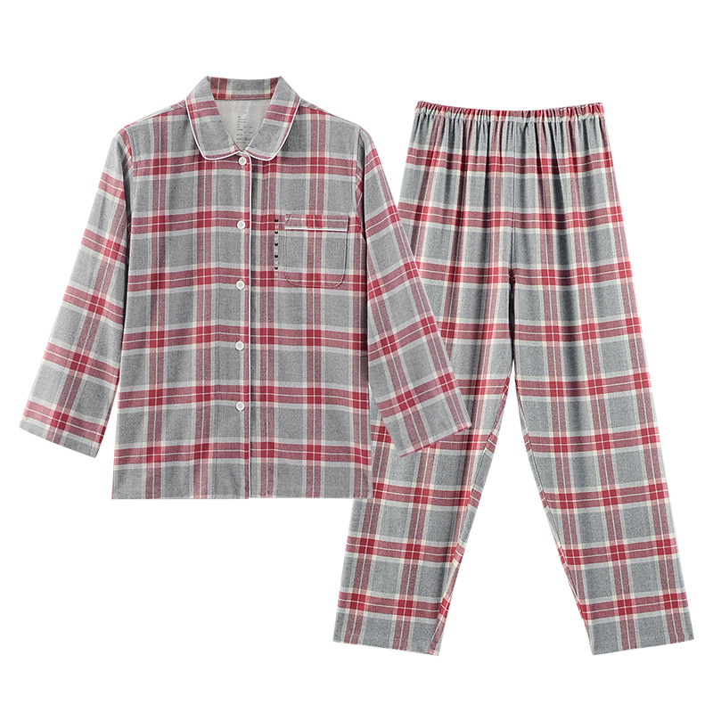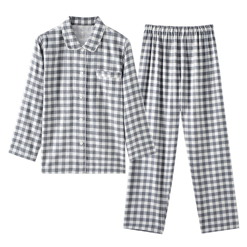 가을과 겨울 순면 잠옷 세트 양털 격자 무늬 홈 옷 여성용 긴 소매 바지 커플 스크럽 격자 무늬 잠옷