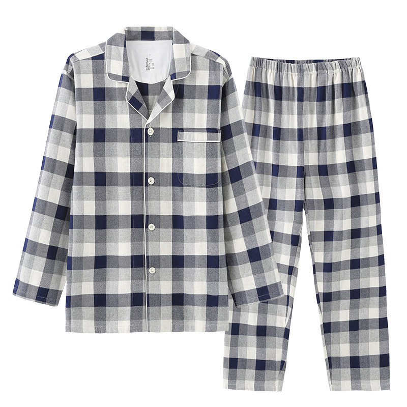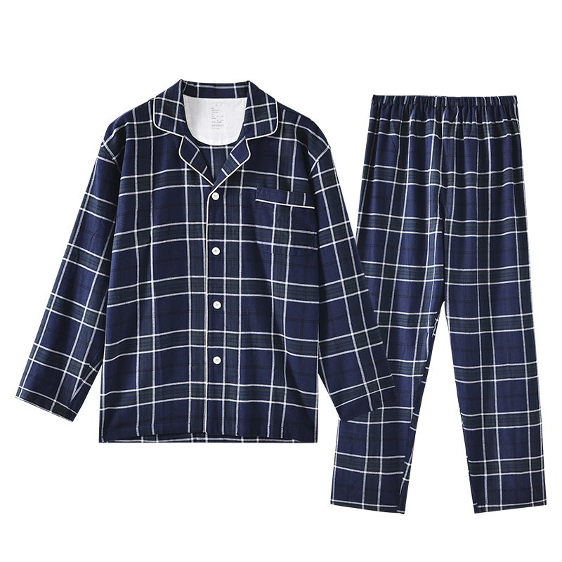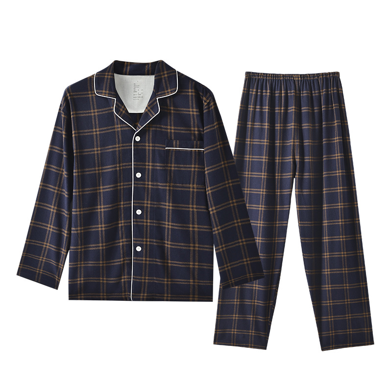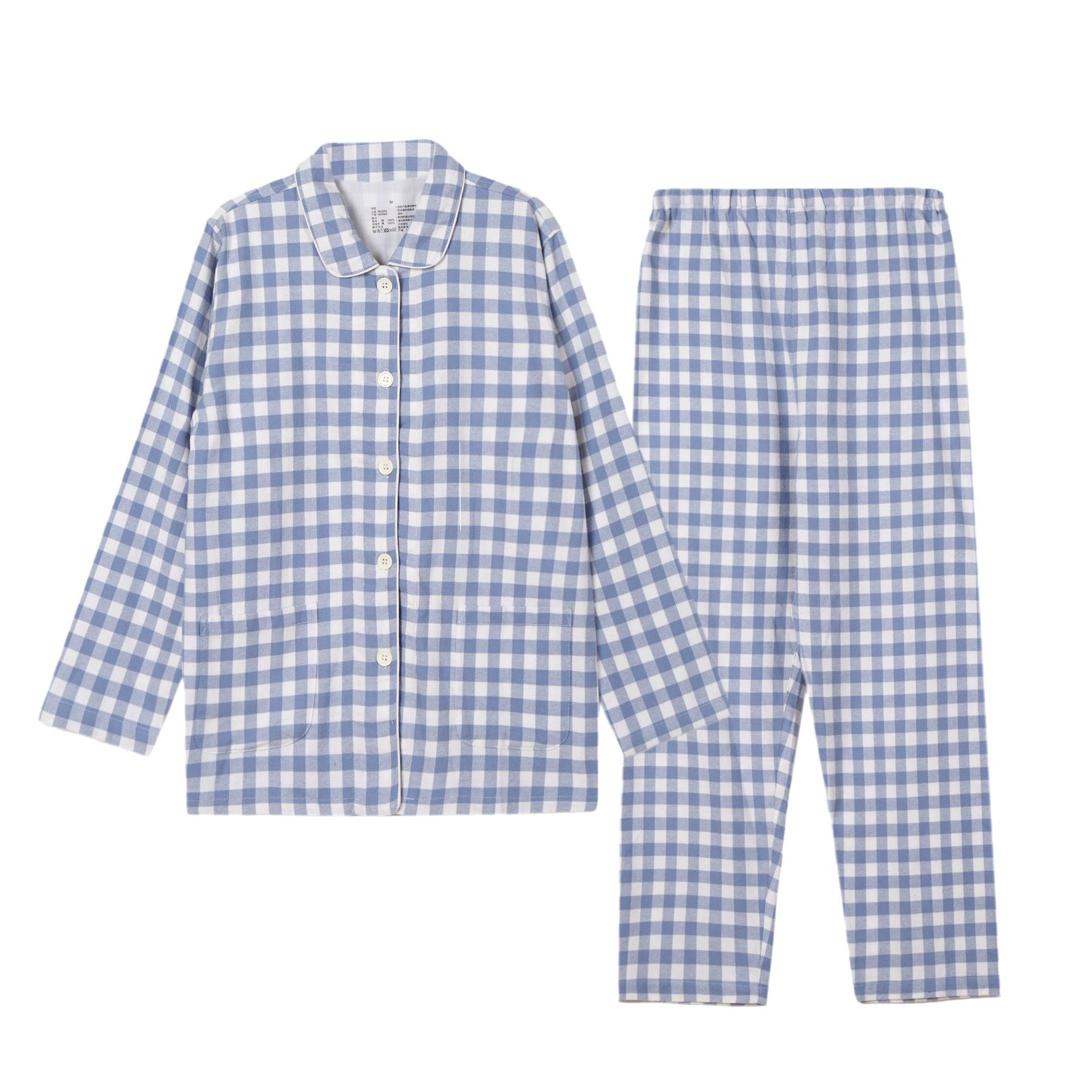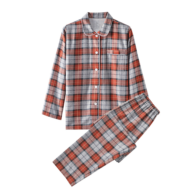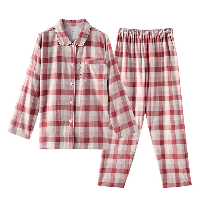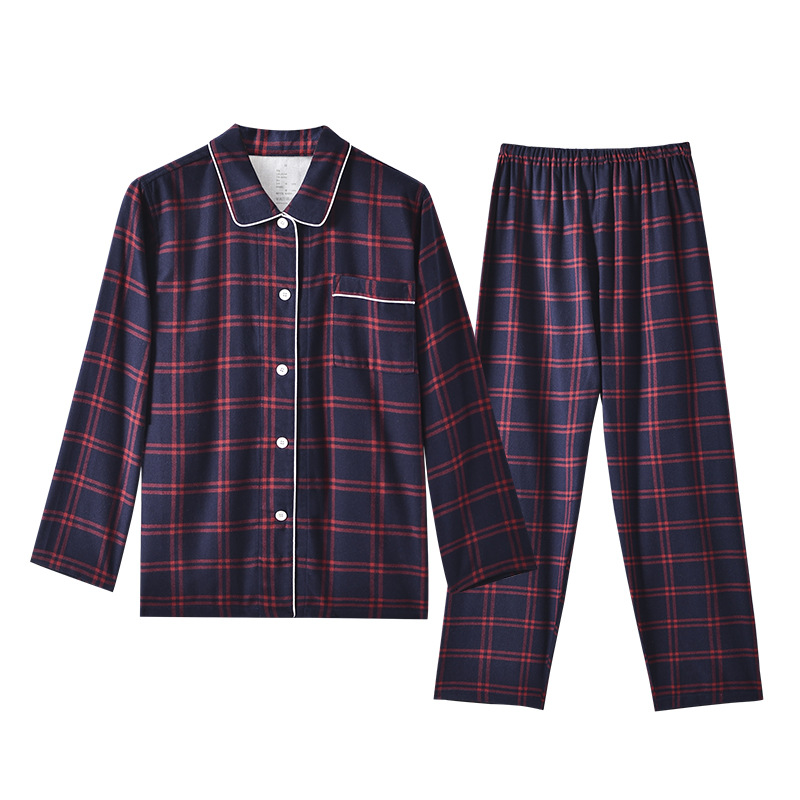 가을과 겨울 순면 잠옷 세트 양털 격자 무늬 홈 옷 여성용 긴 소매 바지 커플 스크럽 격자 무늬 잠옷