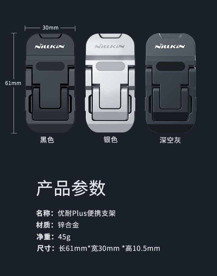 优耐Plus便携支架,可灵活切换3°、11°和16°三种支撑角度,调整用户使用笔记本的舒适度,缓解长时间看屏幕的各种疲劳现象;物理加快散热,笔记本运行更流畅灵敏;体积轻盈小巧,不增加电脑负担,方便随身携带;锌合金材质打造,质感高档,稳固耐用;升级防滑硅胶,支撑更稳,打字不晃动;纳米无痕胶,可重复使用,稳固不脱落。