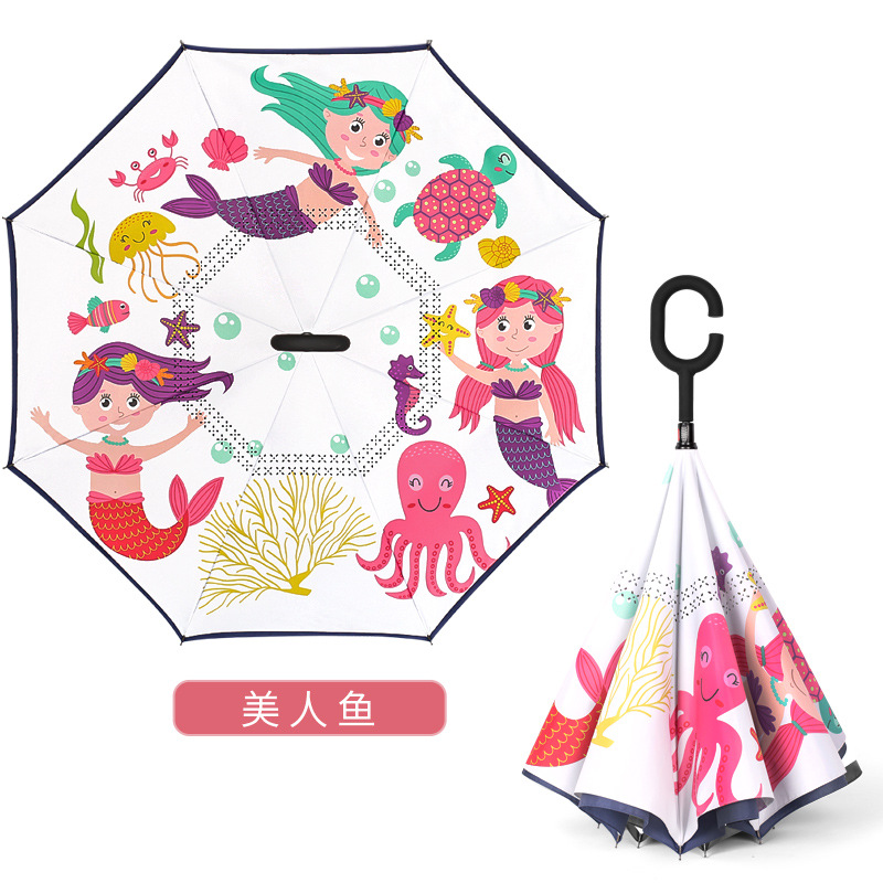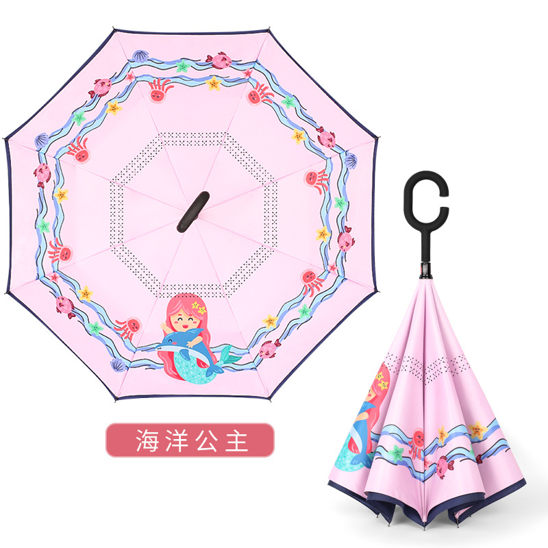 C 핸들 핸즈프리 역방향 이중 우산 어린이 학교 우산 학생 휴대용 우산 남성과 여성 만화 스트레이트 스틱 태양 보호 우산스토어 가기