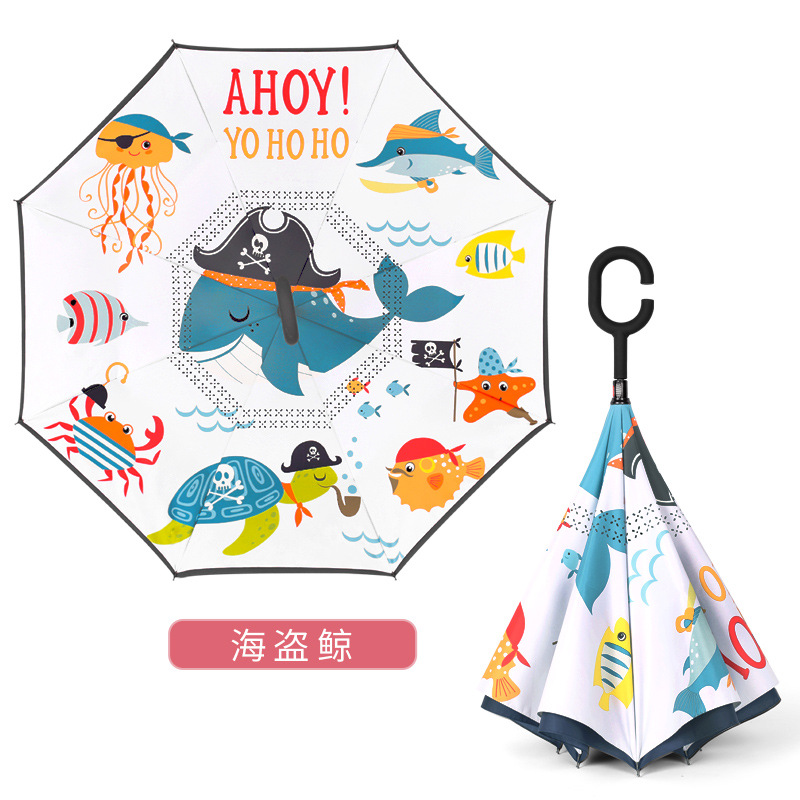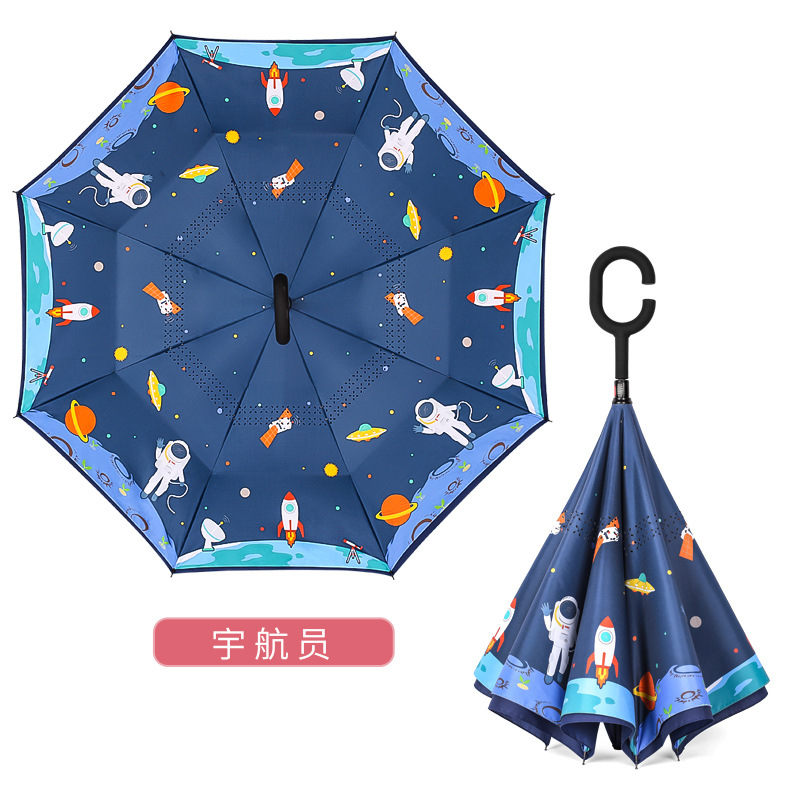 C 핸들 핸즈프리 역방향 이중 우산 어린이 학교 우산 학생 휴대용 우산 남성과 여성 만화 스트레이트 스틱 태양 보호 우산