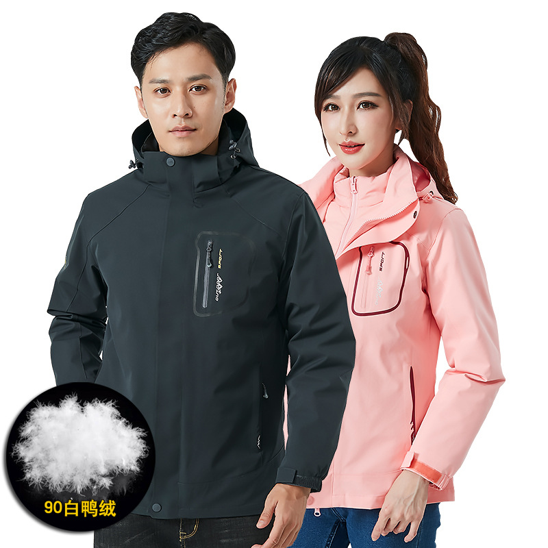 사용자 정의 인쇄 90 화이트 오리 다운 겨울 새로운 야외 쓰리 인 원 러쉬 의류 남성용 투피스 방한 등산 의류 여성스토어 가기