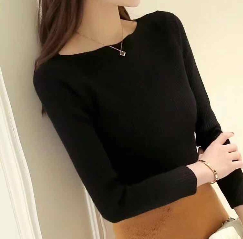 2022 신상품 한 글자 칼라 니트웨어 여성용 올매치 짧은 슬림핏 베이스 셔츠 긴팔 스레드 꽉 풀오버 스웨터