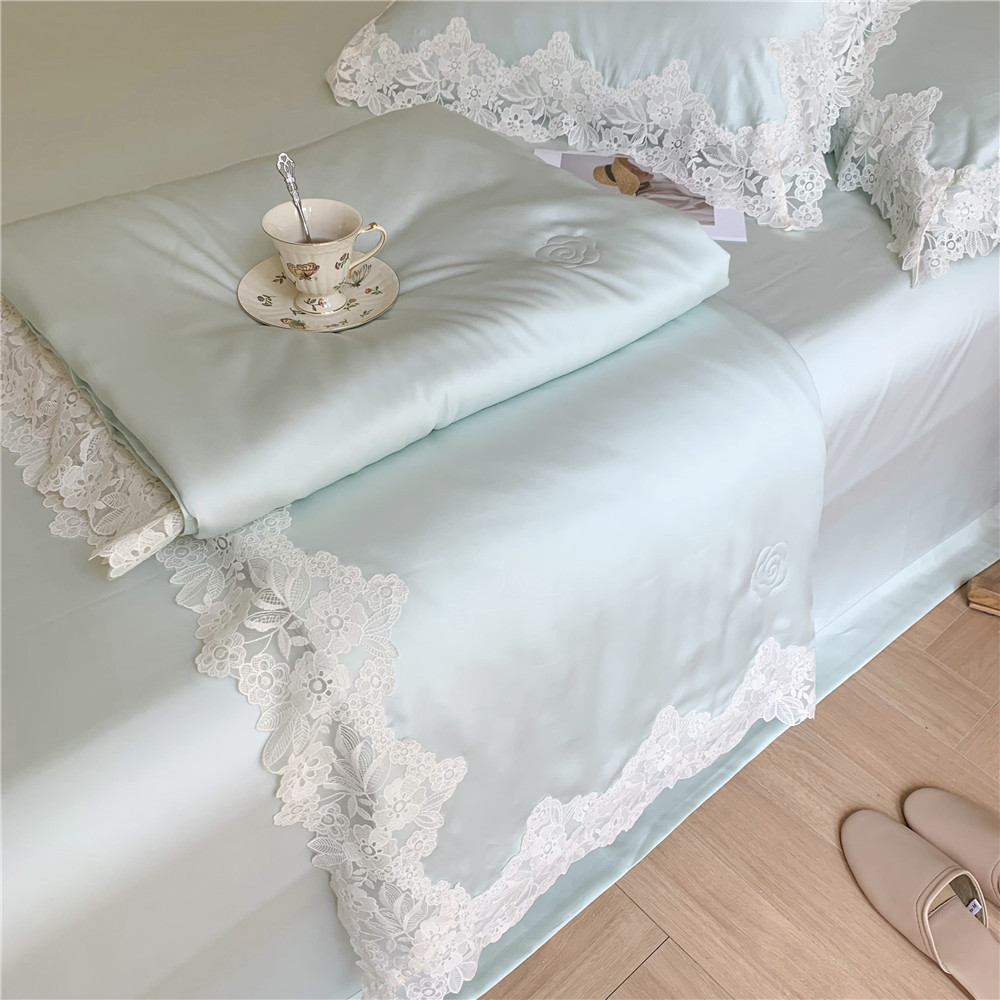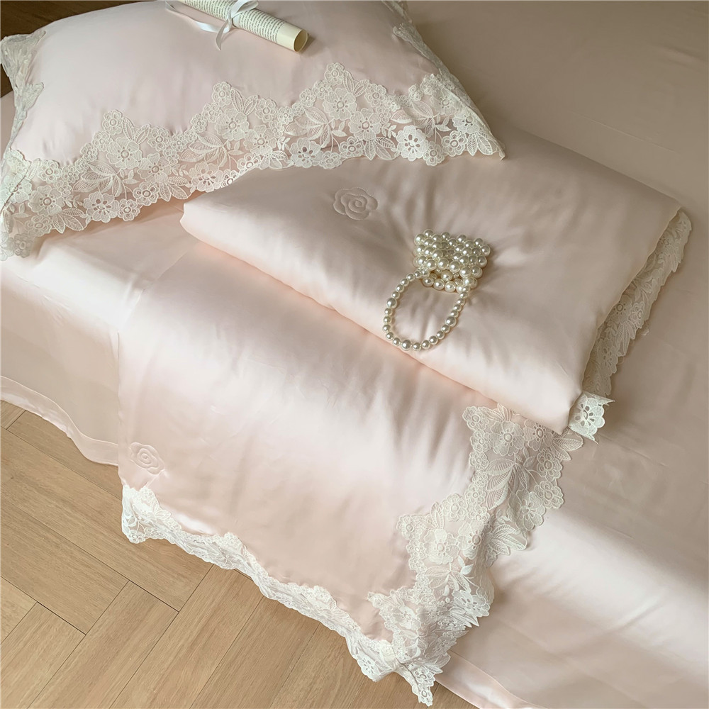 공주풍 레이스 테슬 여름 시원한 이불 4종 세트 여름용 아이스 실크 동백꽃 자수 에어컨 이불