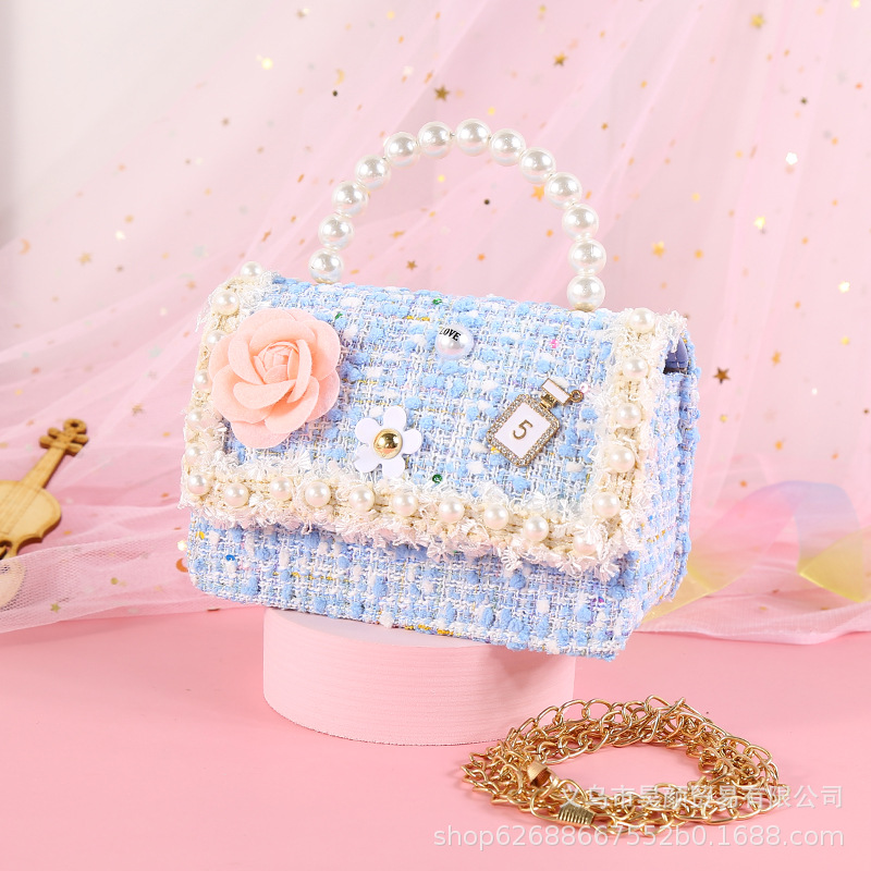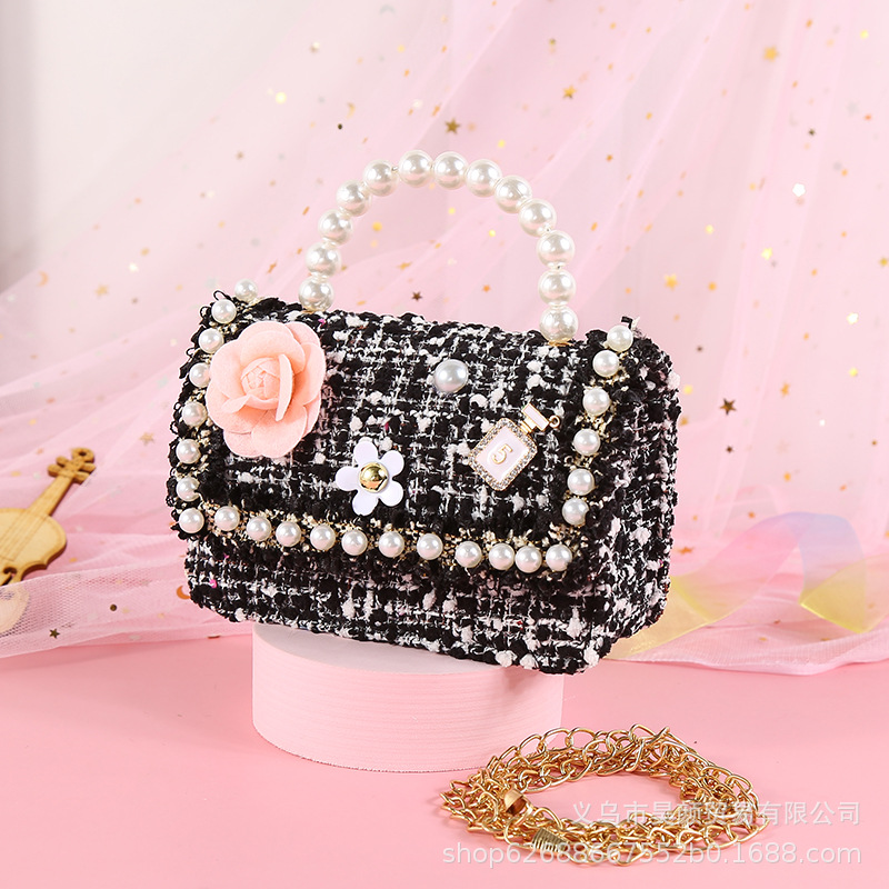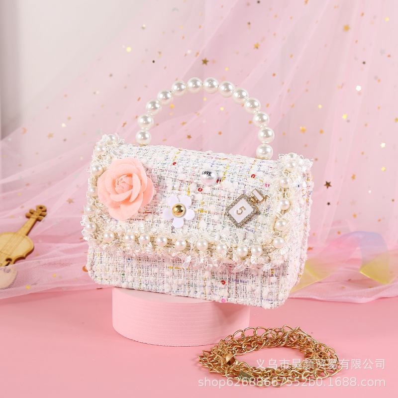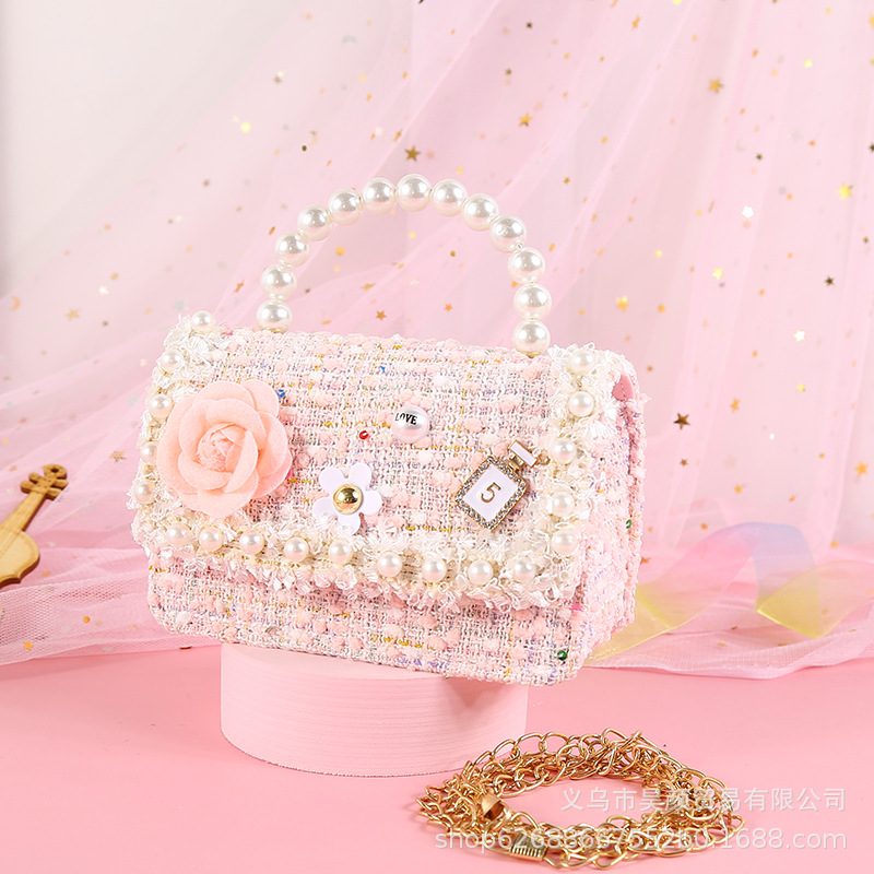 2021 샤넬 스타일 핑크 꽃 진주 레이스 휴대용 크로스바디 이중 사용 진주 귀여운 어린이 가방 917스토어 가기