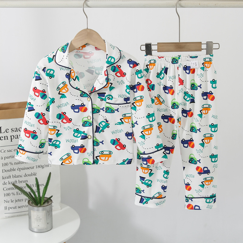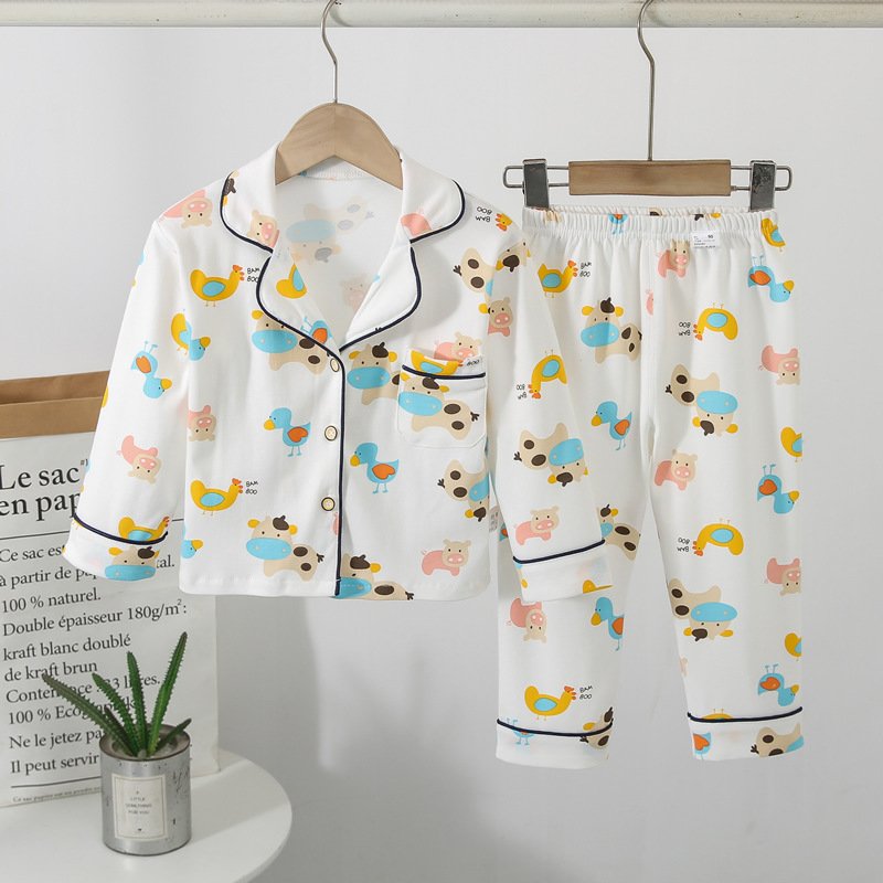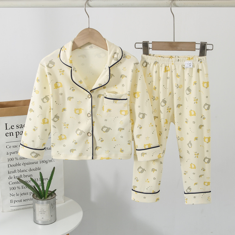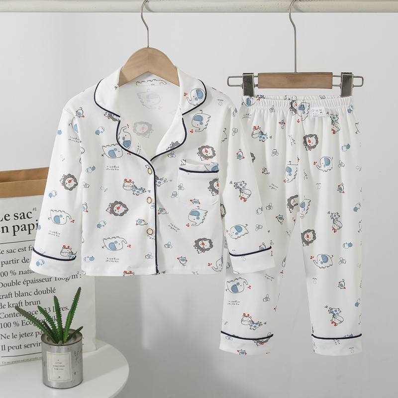어린이 신장 면 긴 소매 잠옷 세트 소년과 소녀 옷깃 가정 옷 봄과 가을 세트 큰 어린이 만화 속옷스토어 가기