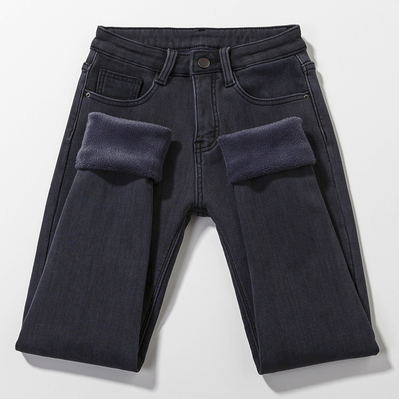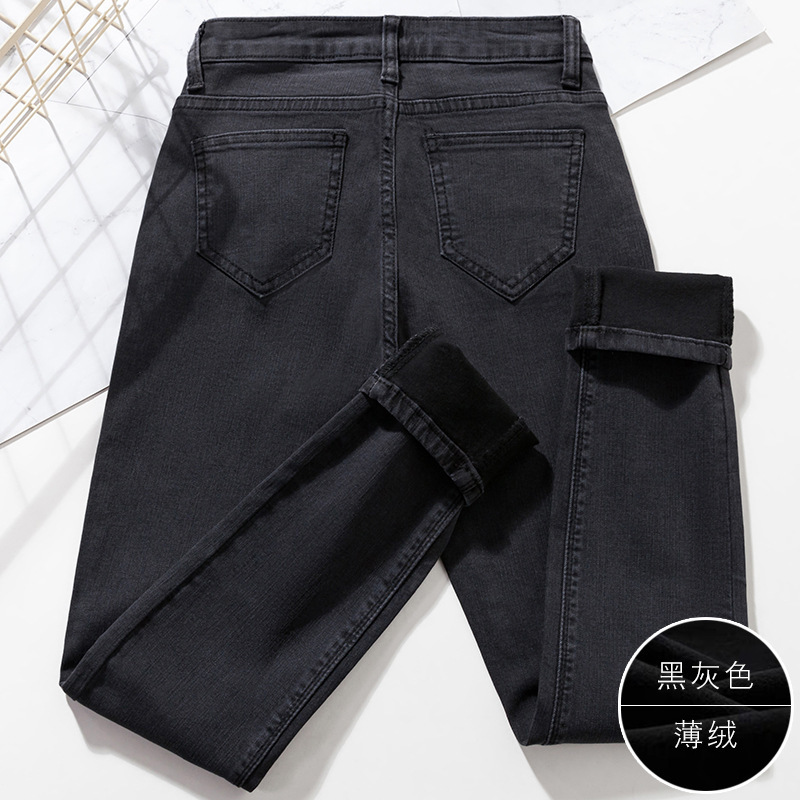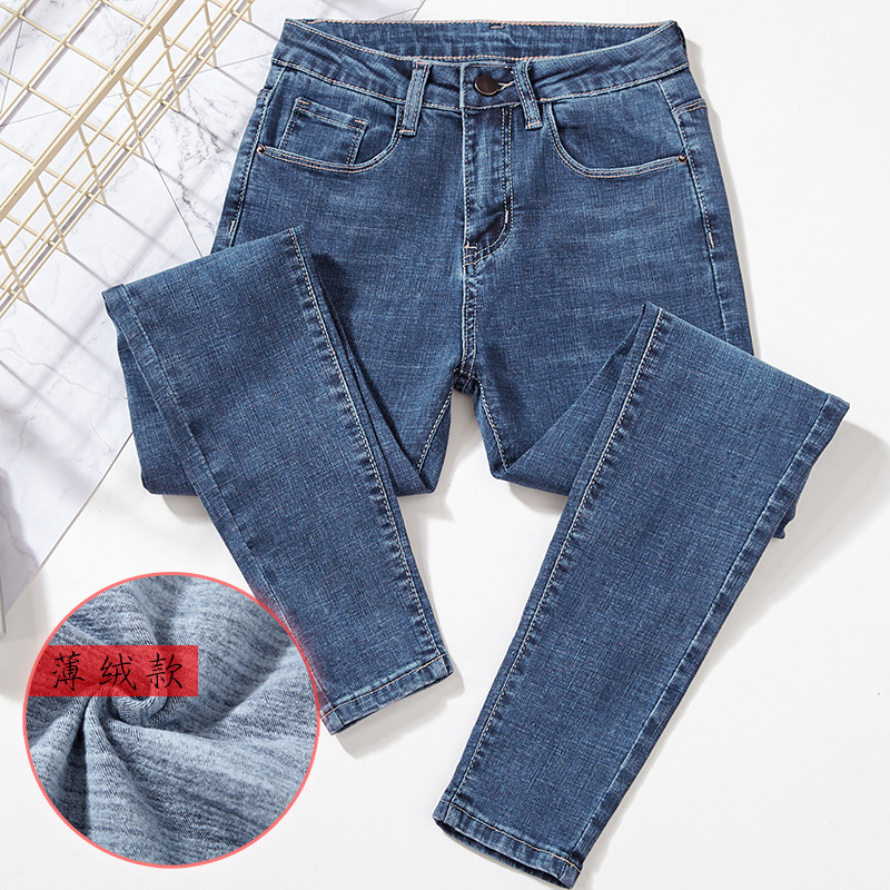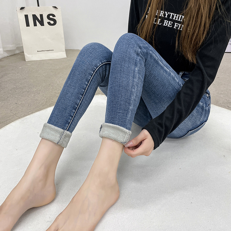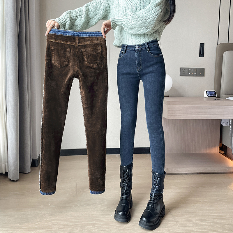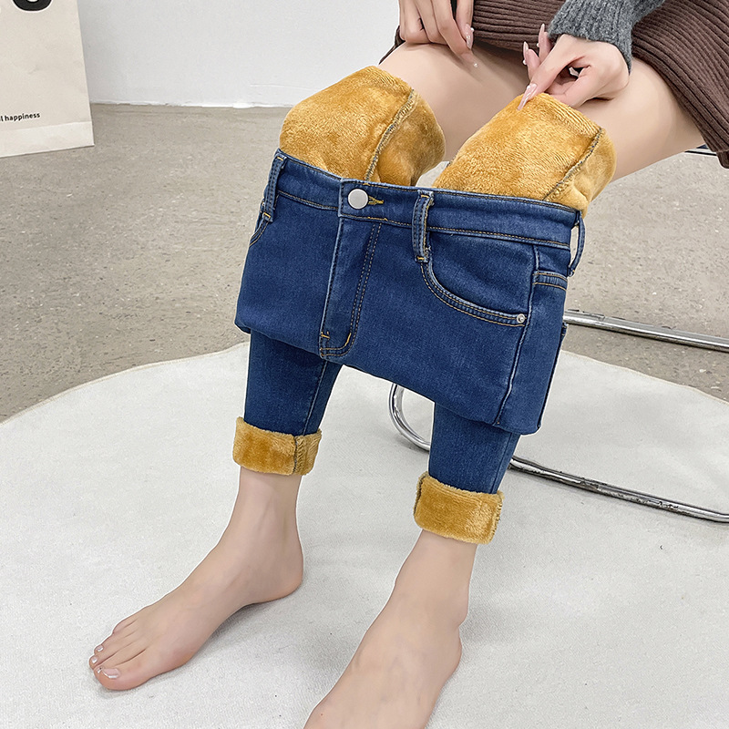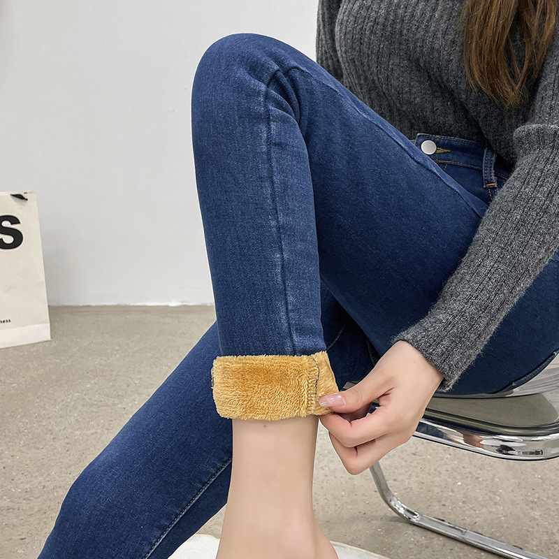 2025 겨울용 기모 하이웨이스트 데님 팬츠 여성 슬림핏 아우터용 펜슬 팬츠 여성용 신축성 두꺼운 트렌디 빅사이즈스토어 가기