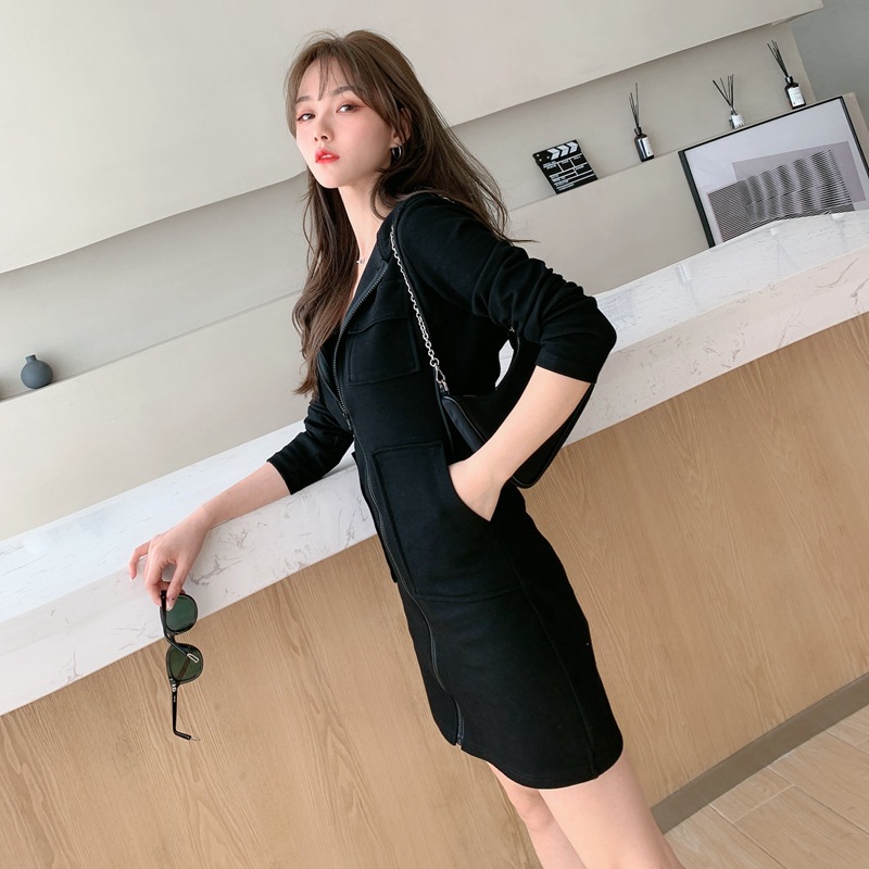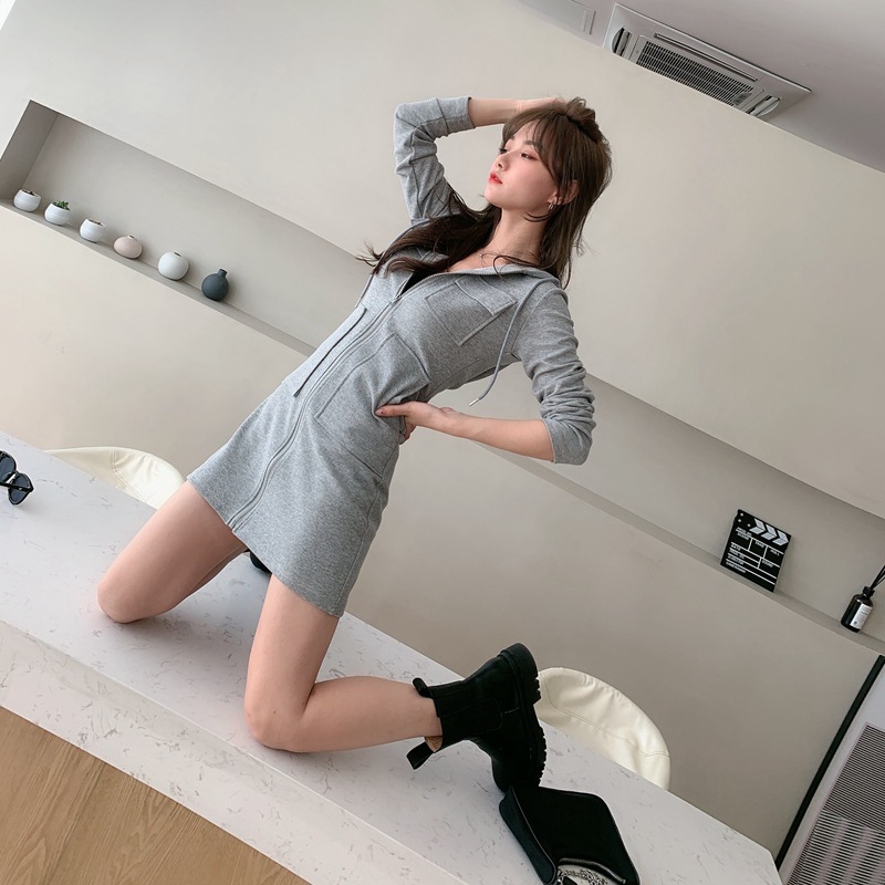 프라이드 스트리트 원피스 이른 봄과 가을 여성의 한국 스타일 캐주얼 유행 긴팔 후드 지퍼 스웨터 짧은 스커트스토어 가기