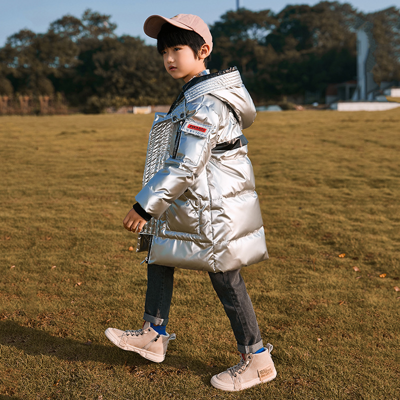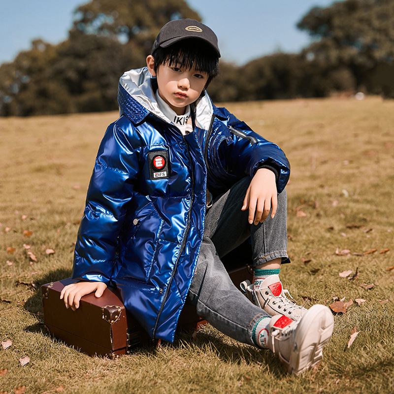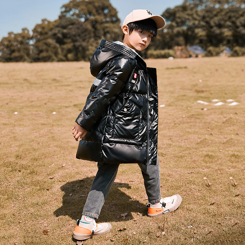 2024 새로운 어린이 다운 재킷 소년 중간 길이 광택 노 워시 두꺼운 중형 및 대형 아동 의류 원피스 드롭 배송
