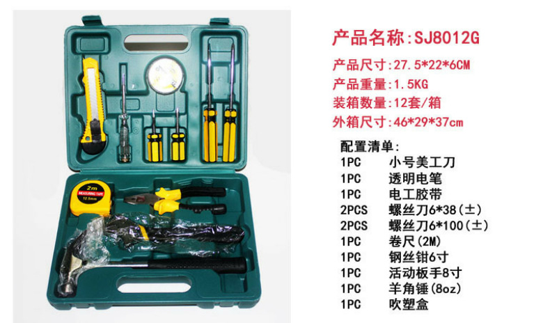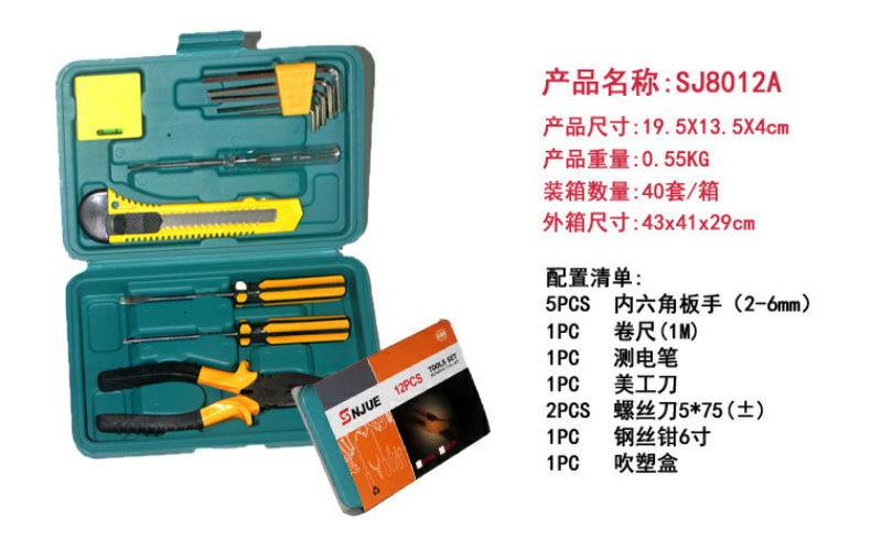 SNJUE五金工具箱12件套 礼品组盒工具套装 随车应急扳手工具8012G