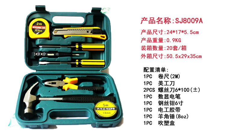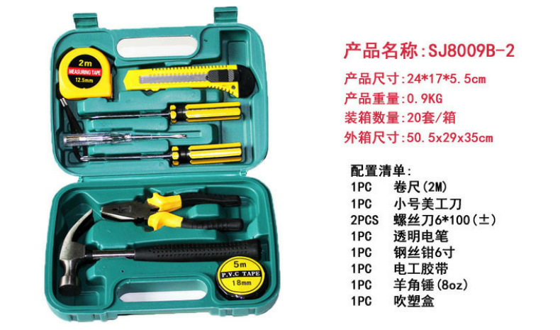 SNJUE 9件套家用五金工具箱锤子实用礼品工具套装组合工具8009B-2