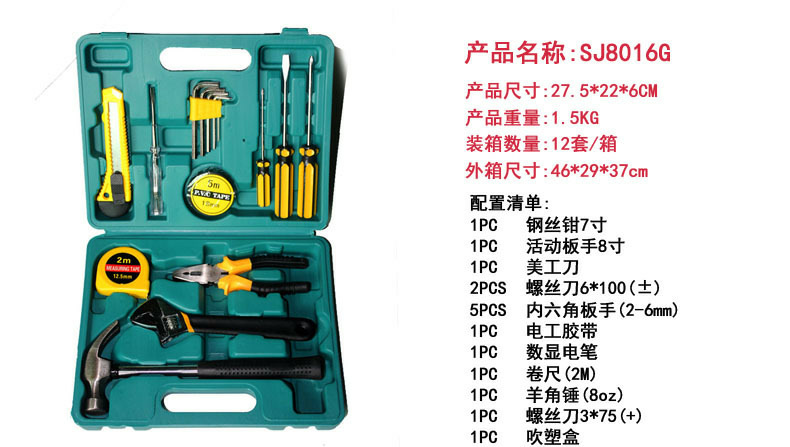 新款16件套五金工具套装车载应急组合套装老虎钳内六角 8016-1