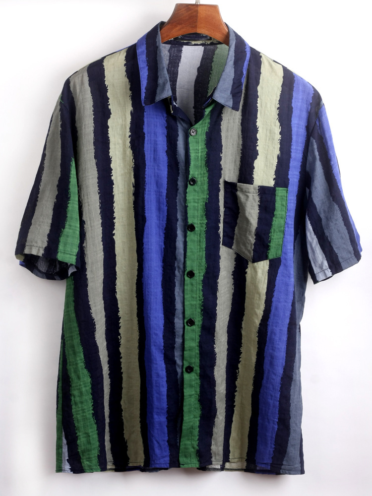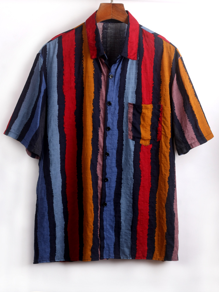새로운 동남아시아 스타일 남성용 면 스트라이프 반팔 셔츠, 유럽 및 미국 해변용 편안한 셔츠