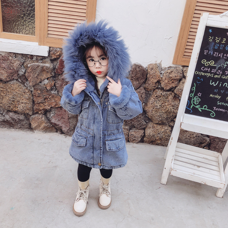 국경 간 대외 무역 아동 의류 새로운 겨울 의류 소녀 플러스 벨벳 칼라 데님 코트 어린이 아기 데님 코트
