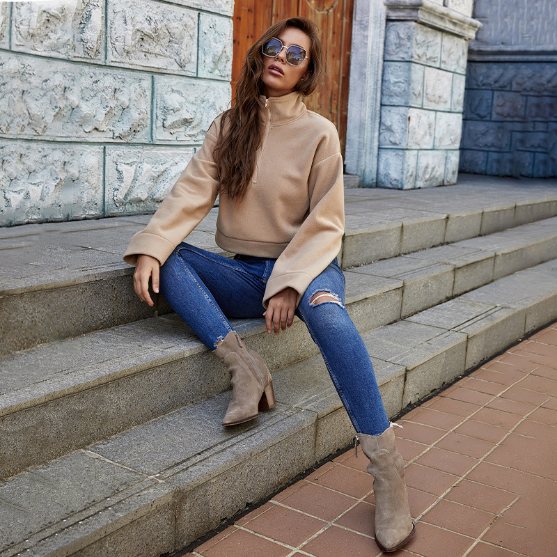 대외 무역 가을과 겨울 새로운 여성용 폴로 칼라 지퍼 긴 소매 느슨한 풀오버 램 울 운동복 짧은 탑 티셔츠