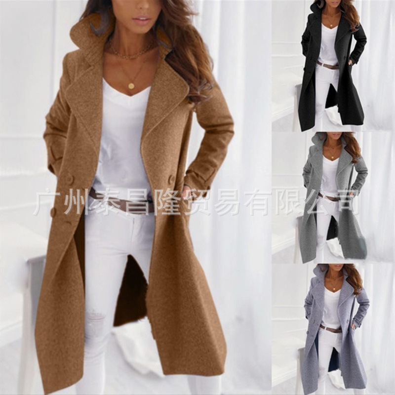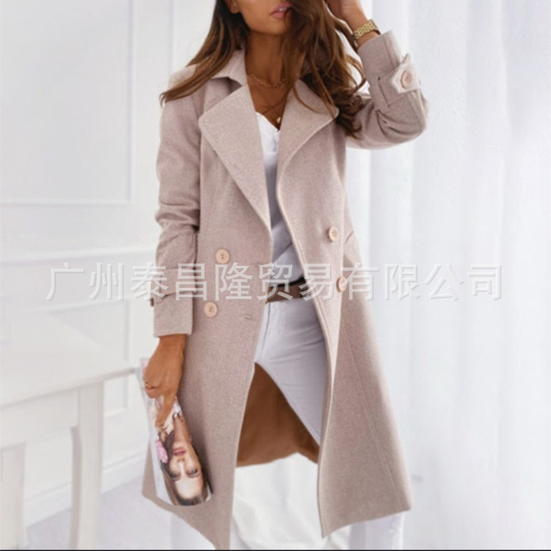 유럽과 미국의 대외 무역 아마존 여성 가을, 겨울 새로운 단색 옷깃 중간 길이 모직 윈드 브레이커 코트 여성 코트스토어 가기