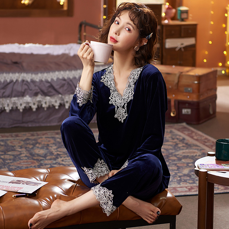 잠옷 여성 봄과 가을 2022 새로운 패션 골드 벨벳 긴팔 바지 투피스 심플 캐주얼 여성 가정복스토어 가기