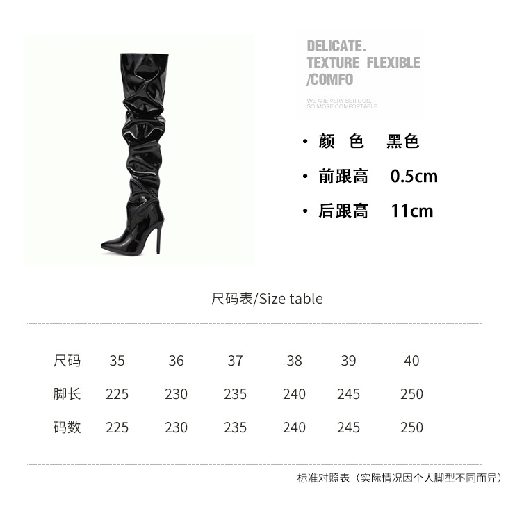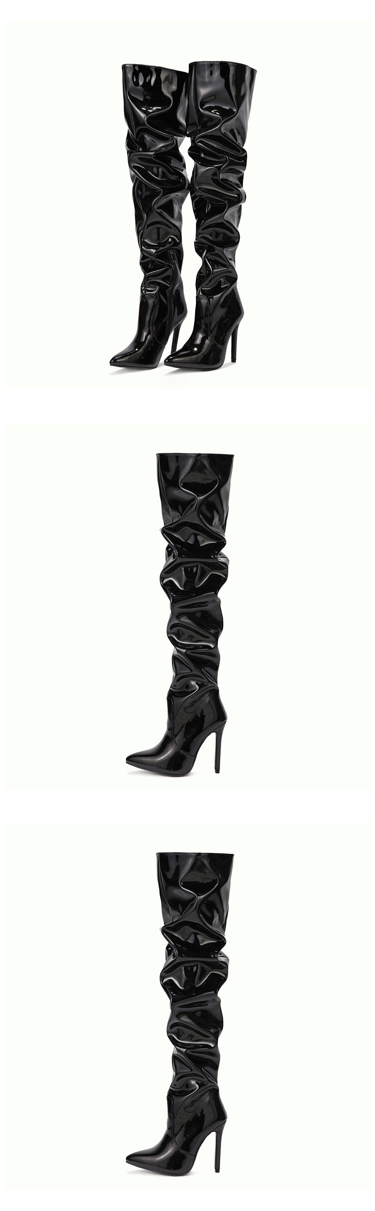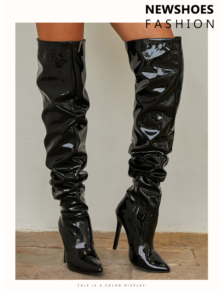 스트레치 오버 더 니 부츠 2020 가을 새로운 유럽과 미국의 뾰족한 에나멜 가죽 고층 블랙 지퍼 얇은 굽 여성 부츠