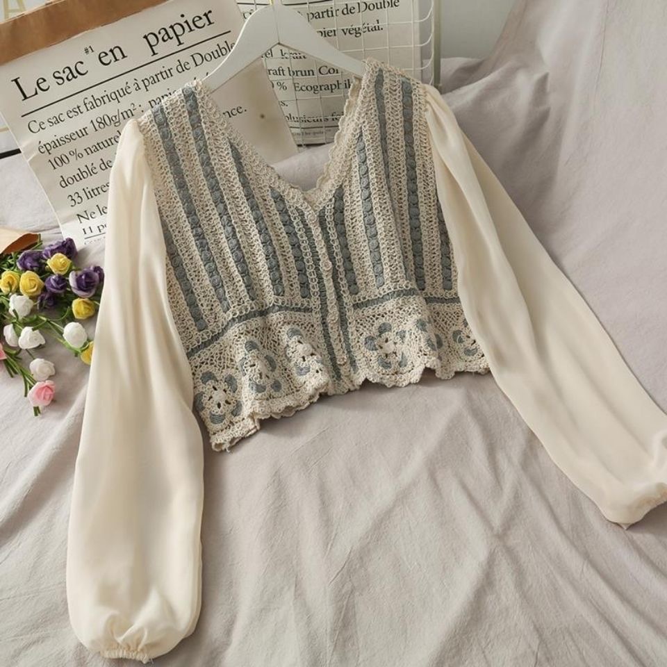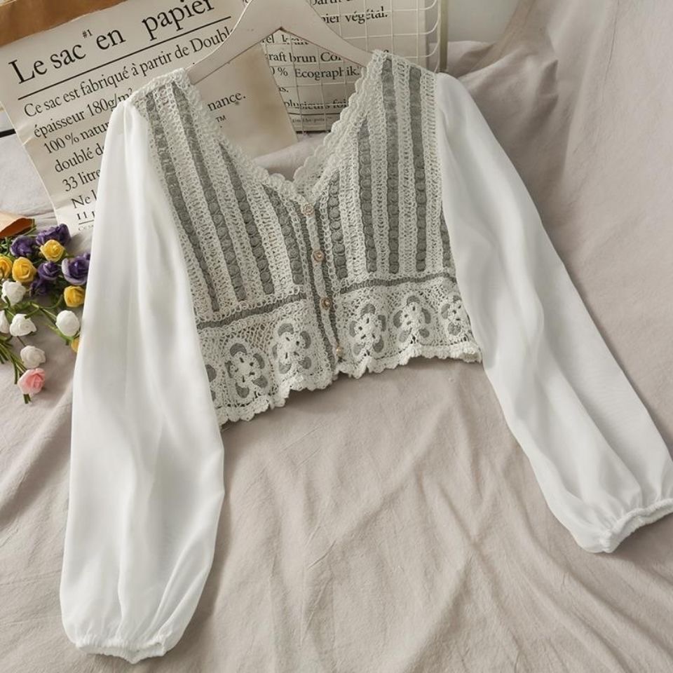 셔츠 여자의 가을 긴팔 탑 디자인 틈새 V-넥 빈티지 크로 셰 뜨개질 중공 쉬폰 셔츠 짧은 셔츠