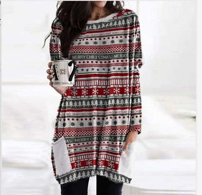 가을 격자 무늬 빨간색 인쇄 도시 캐주얼 풀오버 스티칭 라운드 넥 성인 중간 길이의 유럽과 미국 여성복스토어 가기