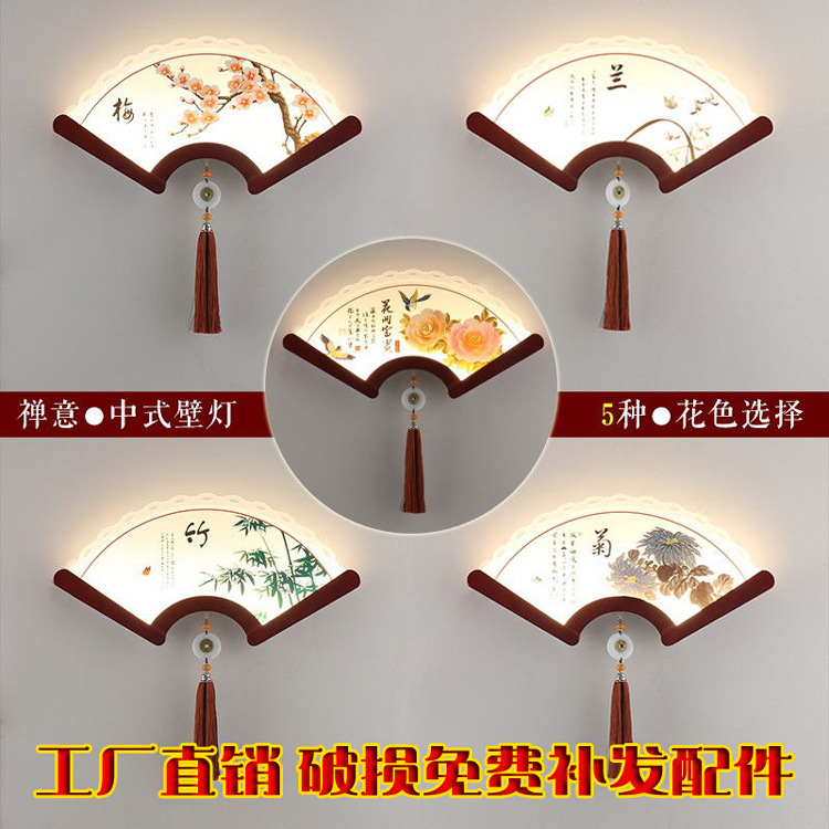 중국 벽화 램프 팬 벽 램프 LED 단단한 나무 베란다 거실 배경 벽 램프 침실 침대 옆 램프 통로 램프