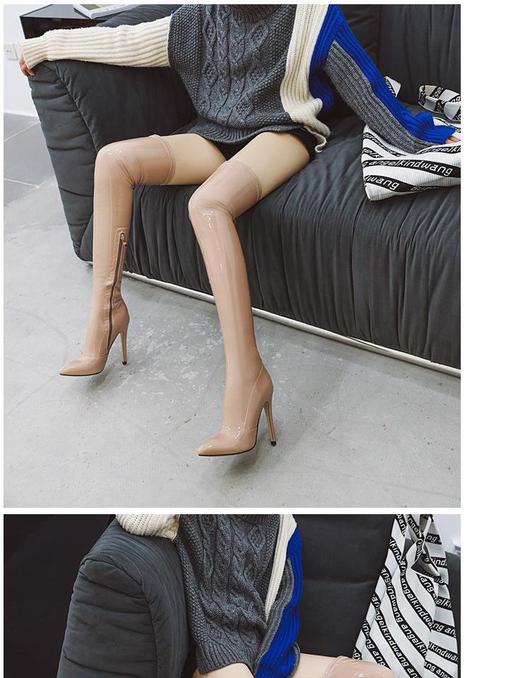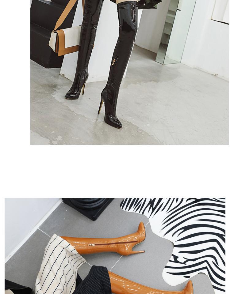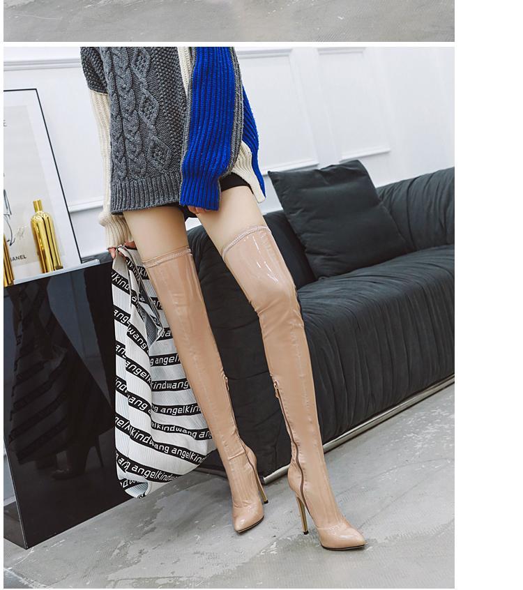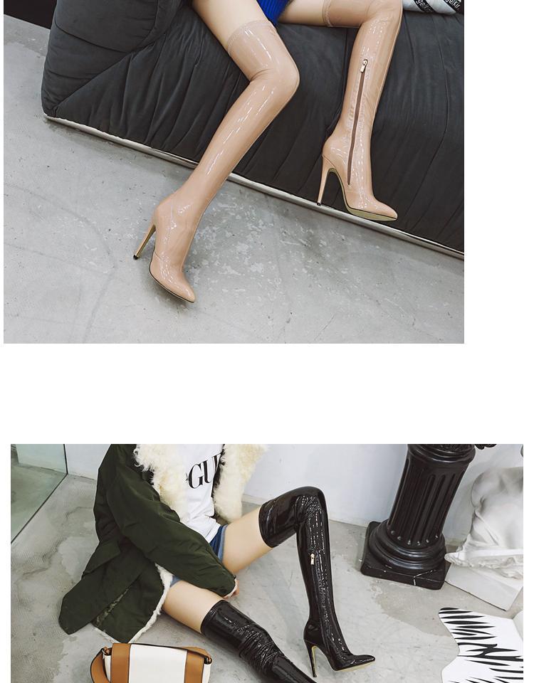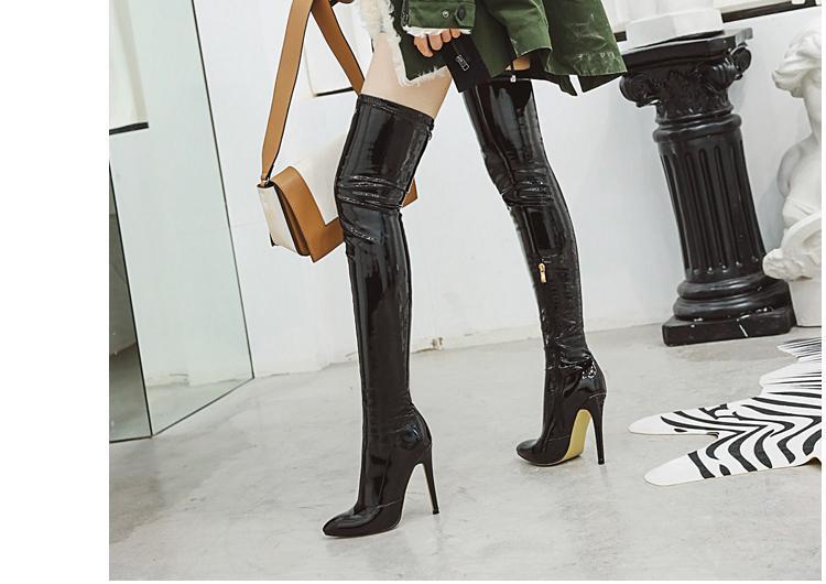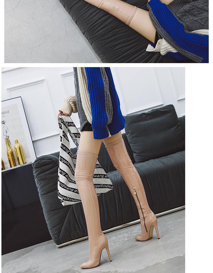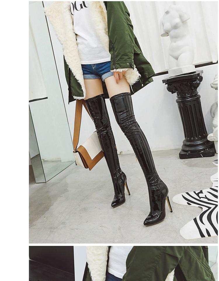 스틸 튜브 댄스 부츠 뾰족한 얇은 굽 하이힐 나이트 부츠 유럽과 미국 스타일 섹시한 검은 무릎 위 부츠 밝은 가죽 여성용 부츠