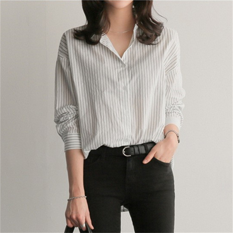 2023 가을 새로운 중간 길이 모든 매치 느슨한 블루 세로 스트라이프 BF 플러스 사이즈 긴팔 셔츠 여름스토어 가기