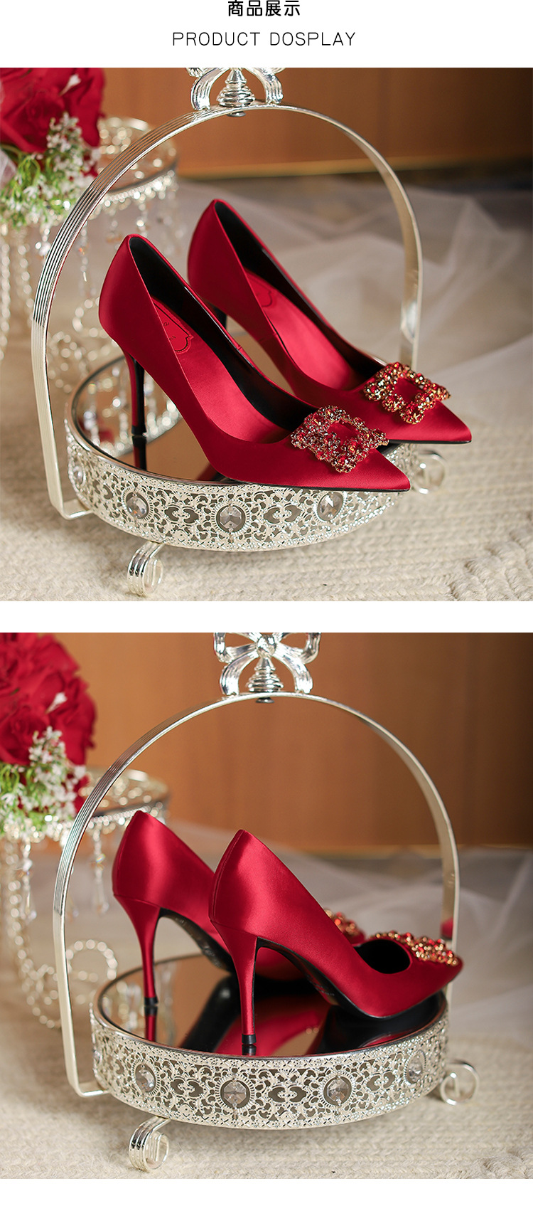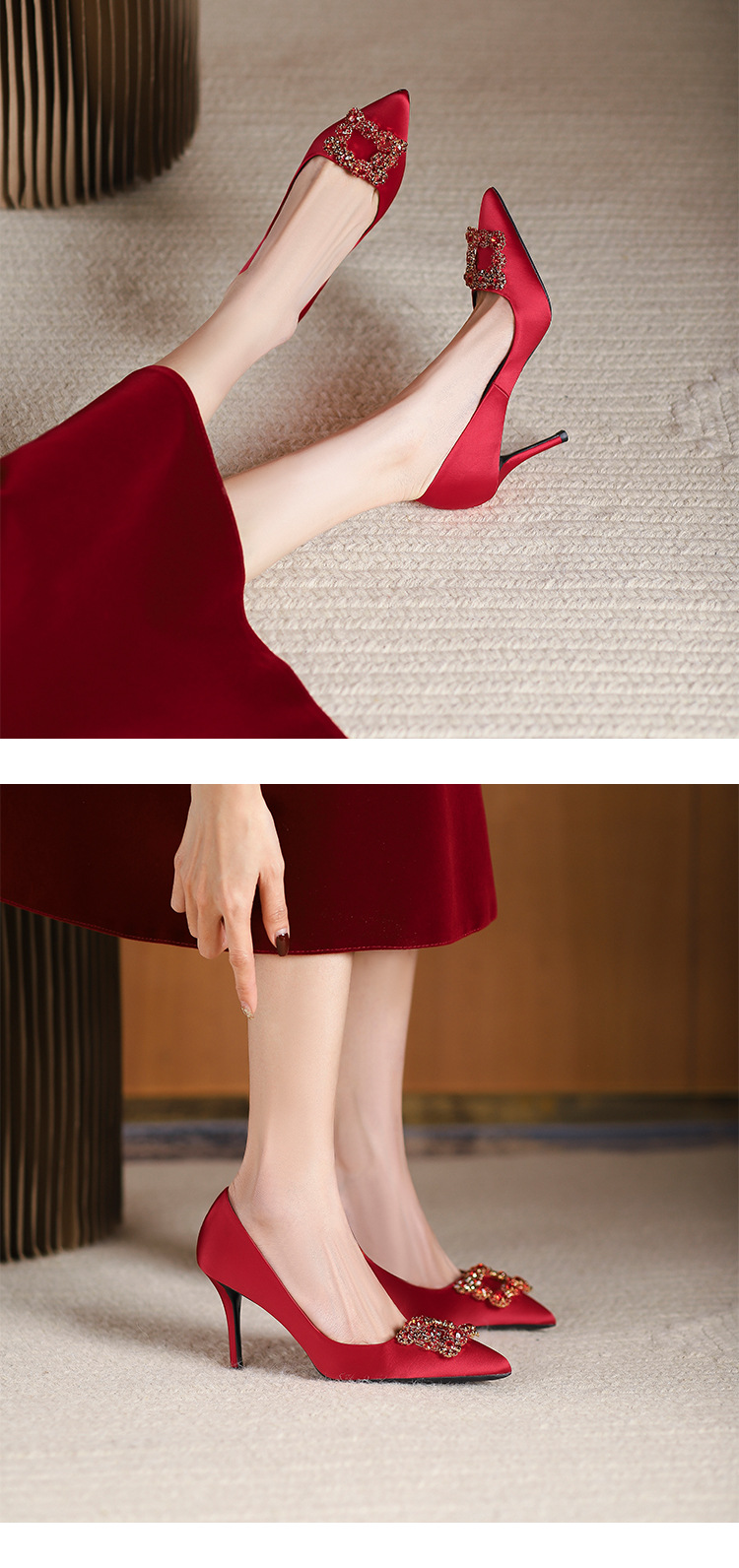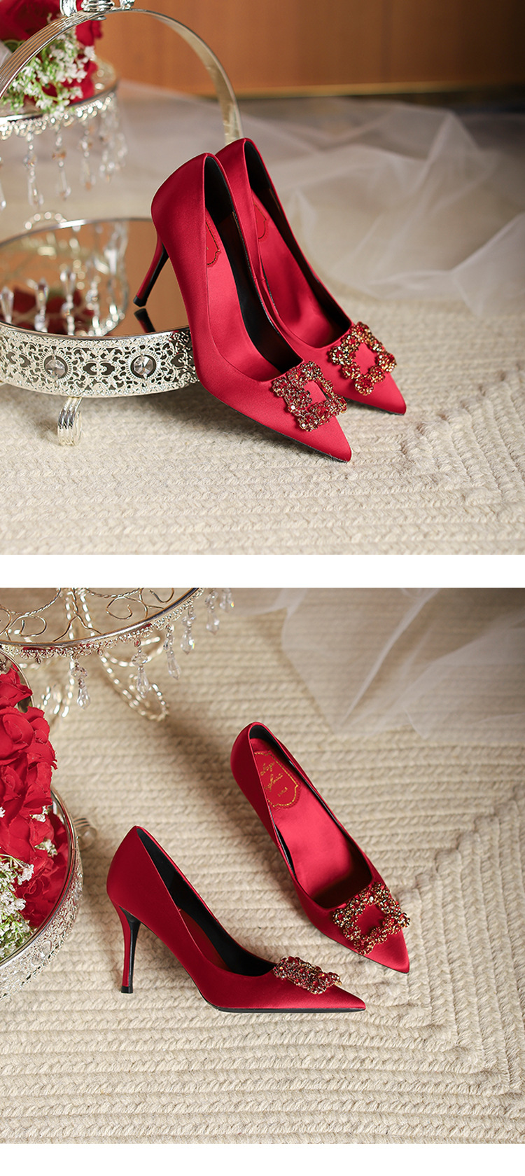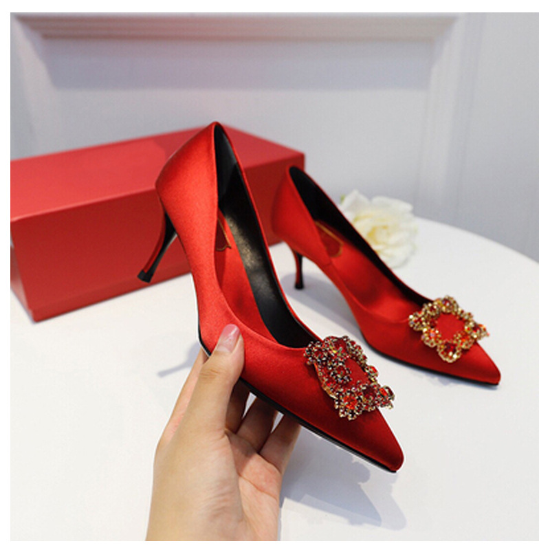 2025 새로운 유럽과 미국의 레드 하이힐 웨딩 슈즈 스틸레토 힐 라인스톤 포인팅 신부 들러리 입 얕은 웨딩 슈즈 여성스토어 가기