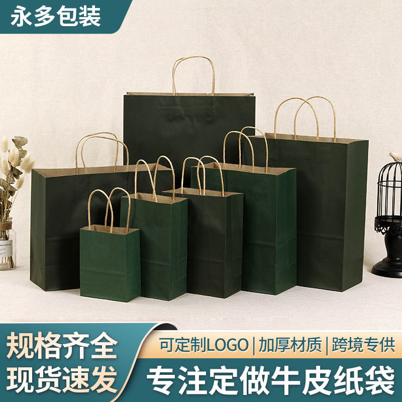 재고 다크 그린 크래프트 종이 토트 백 도매 광고 쇼핑 선물 종이 가방 테이크 아웃 포장 가방 인쇄 로고스토어 가기