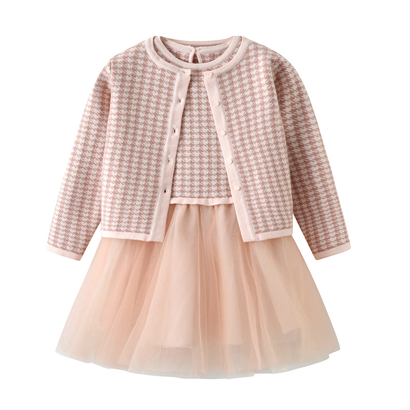 가을 겨울 여아 공주 드레스 세트, 물떼새 격자 무늬 니트 가디건, 조끼와 거즈 스커트가 결합된 세련된 투피스 세트