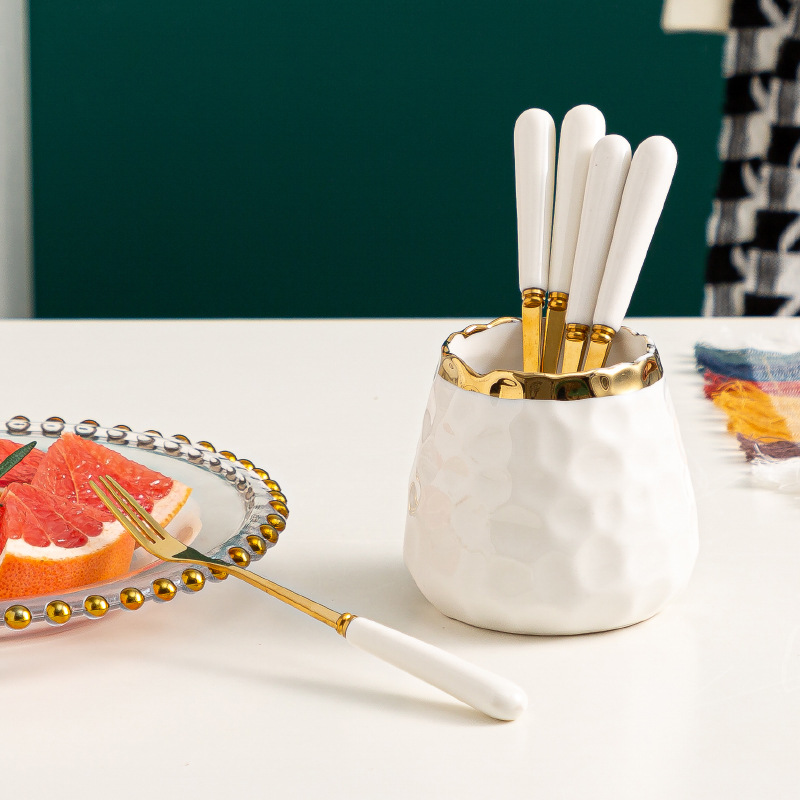 국경 과일 포크와 스푼 망치 패턴 세라믹 저장 용기 세트 가정용 스테인레스 스틸 과일 선택 디저트 포크 도매