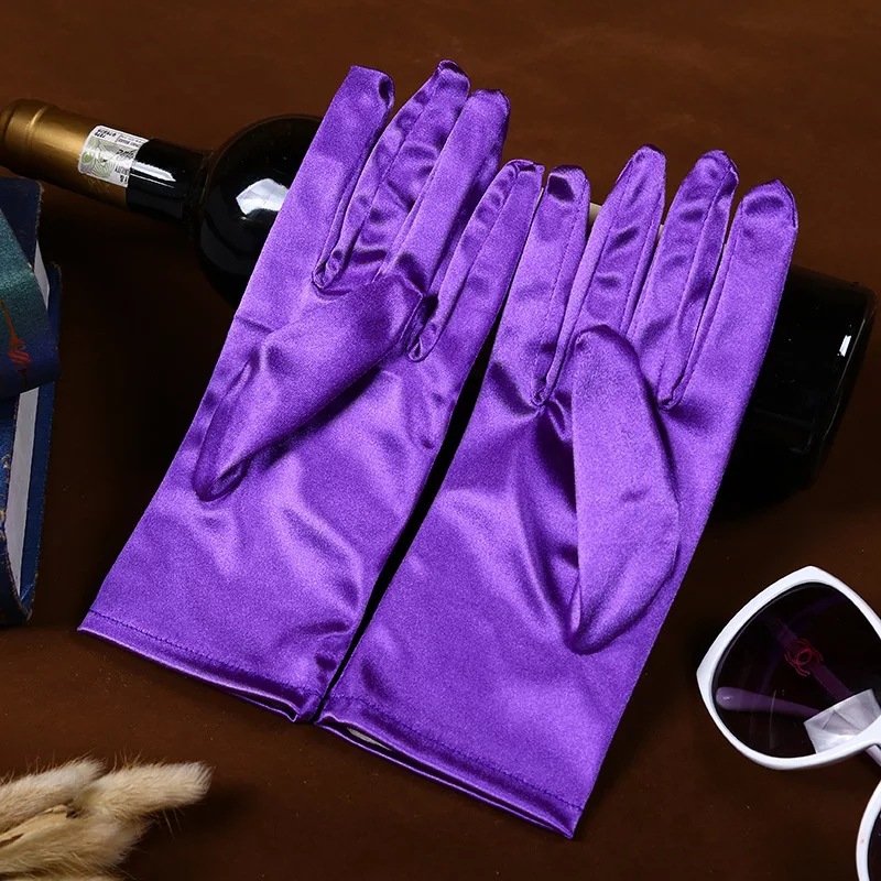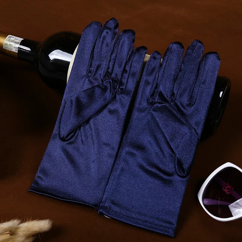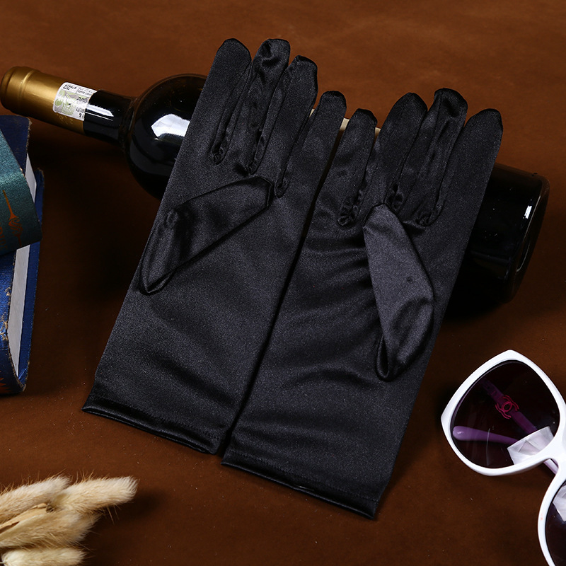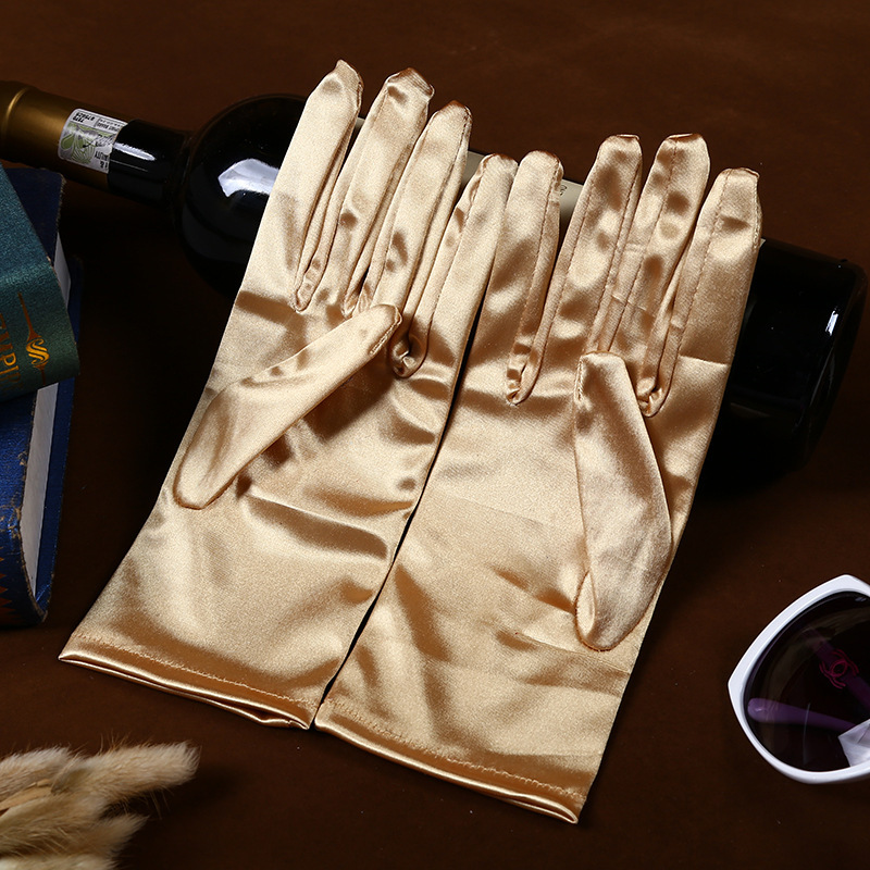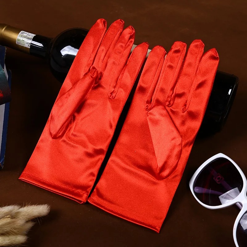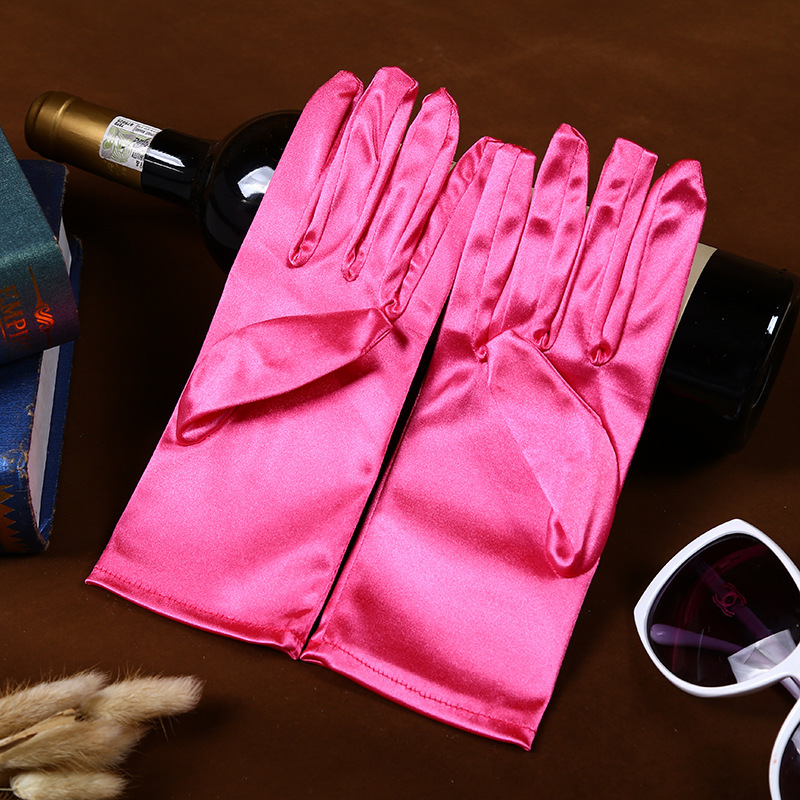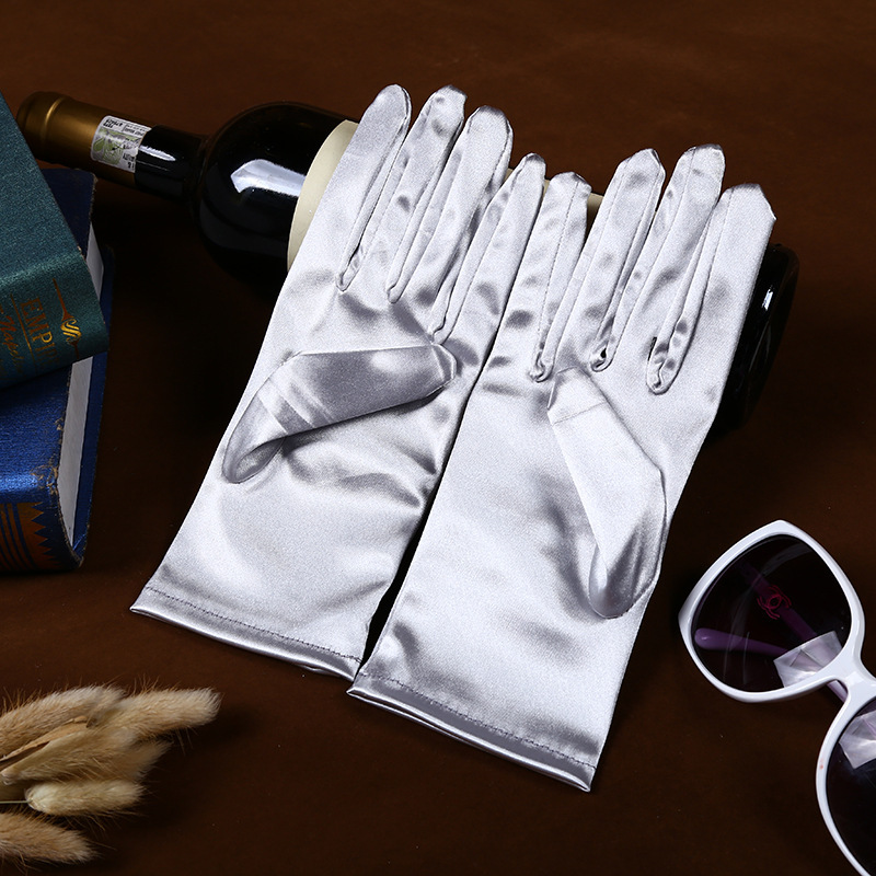 공장 직공급 성인 짧은 의류 액세서리 장갑 스트레치 밝은 새틴 패브릭 웨딩 에티켓 보석 장갑스토어 가기