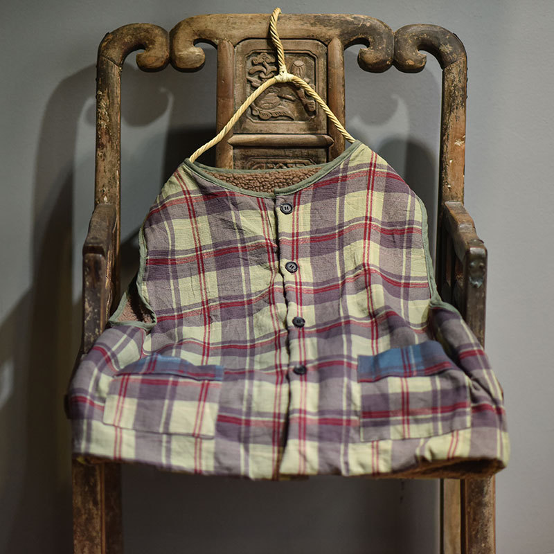 水洗做旧全棉格子开衫仿羊羔绒内胆