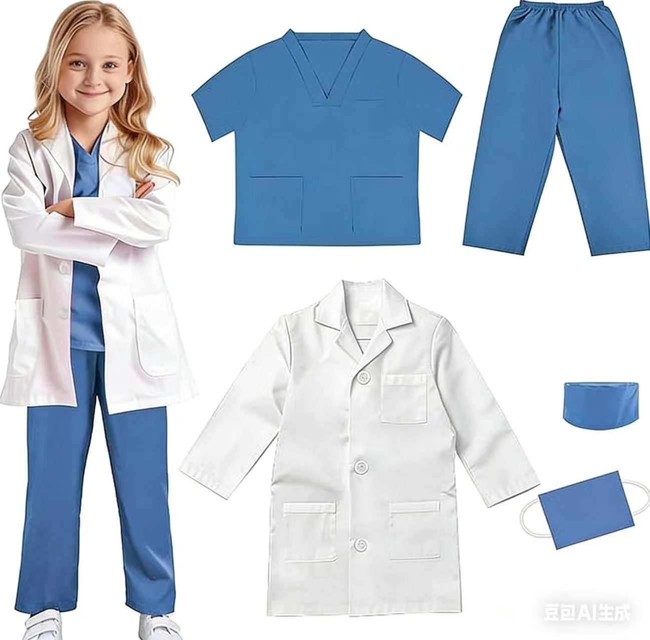 • 흰색 의사 가운 + 코발트 블루 V넥 셔츠 + 청진기 + 의료진 ID 카드
