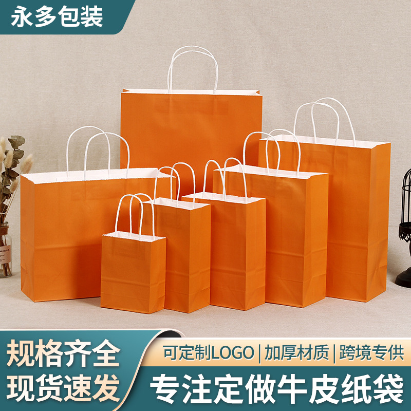 재고 크래프트 종이 가방 화장품 오렌지 휴대용 선물 가방 의류 쇼핑 차 포장 가방 인쇄 로고스토어 가기
