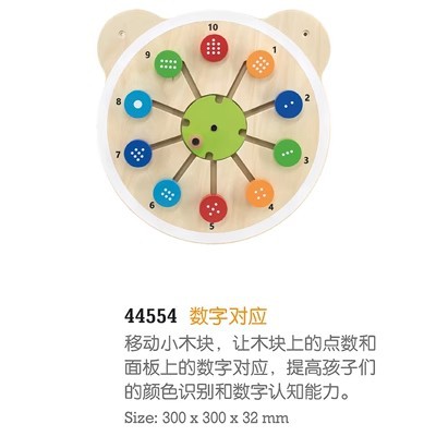 产品特点: 游戏板可固定在幼儿园的走廊、过道、房间墙面上,不占空间,是很好的装饰游戏产品。通过游戏,可以提高孩子的手指灵活性和观察力,适合幼儿园、亲子园、早教中心、幼教培训机构等儿童活动场所