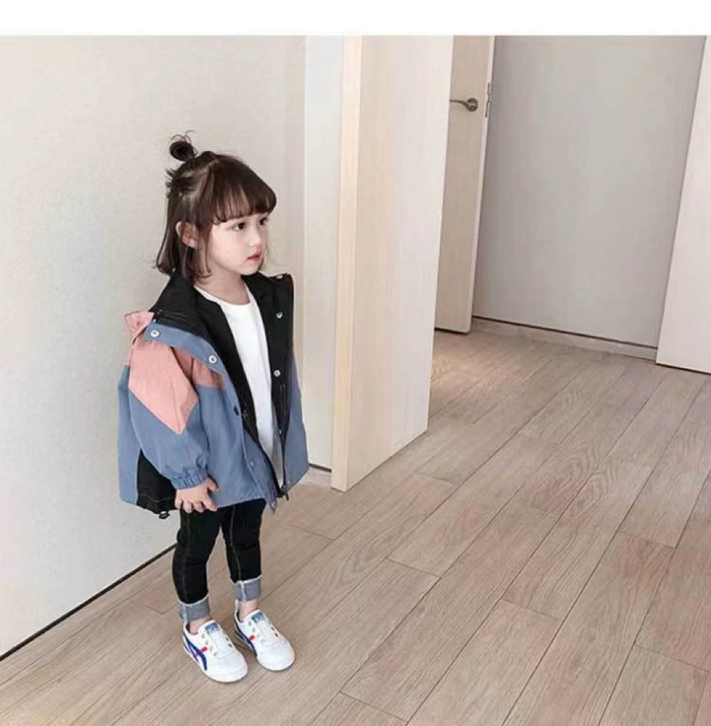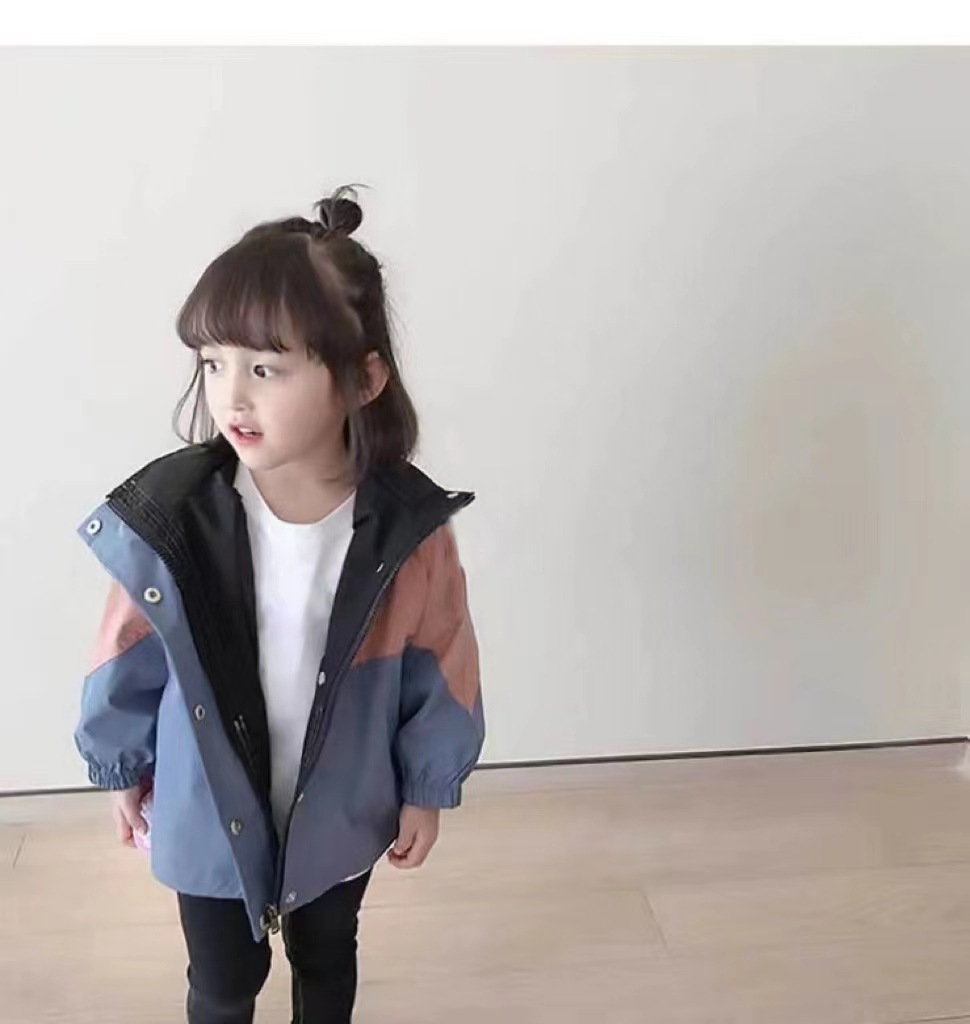 2023 봄과 가을 컬러 매칭 여아 코트 새로운 아동 짧은 윈드 브레이커 여성 아기 후드 폭행 옷 도매스토어 가기