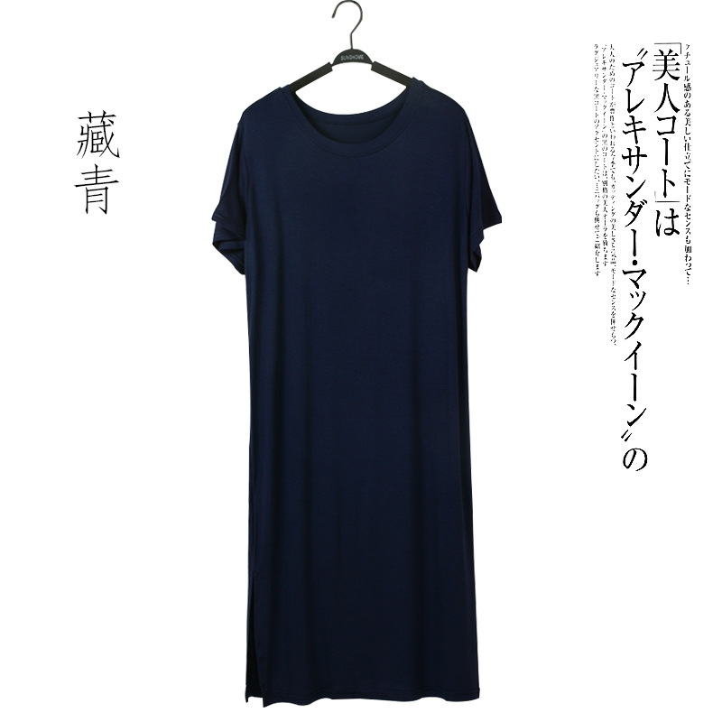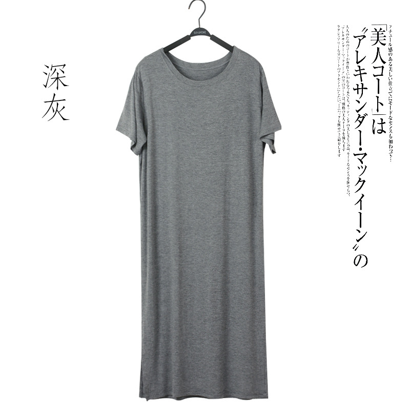 여름 한국 스타일 여자의 짧은 소매 모달 원피스 느슨한 원피스 가을 복장 라운드 넥 스플릿 베이스 스커트 플러스 사이즈