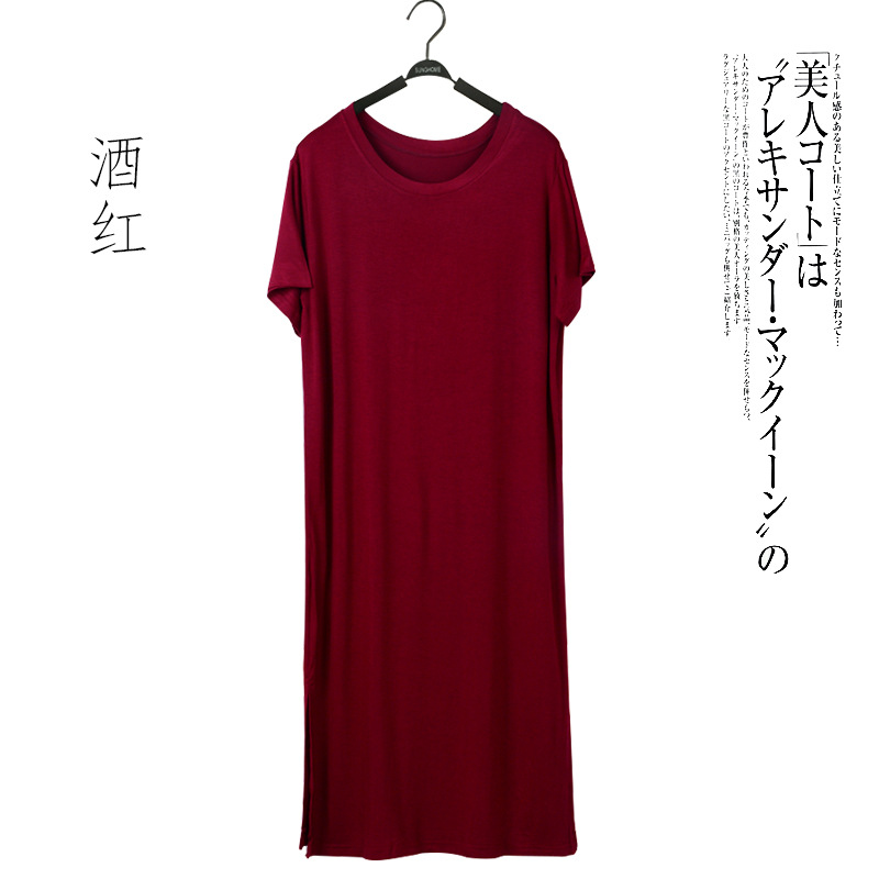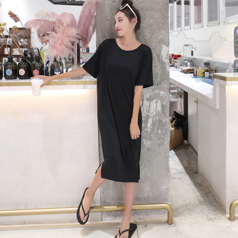 여름 한국 스타일 여자의 짧은 소매 모달 원피스 느슨한 원피스 가을 복장 라운드 넥 스플릿 베이스 스커트 플러스 사이즈스토어 가기