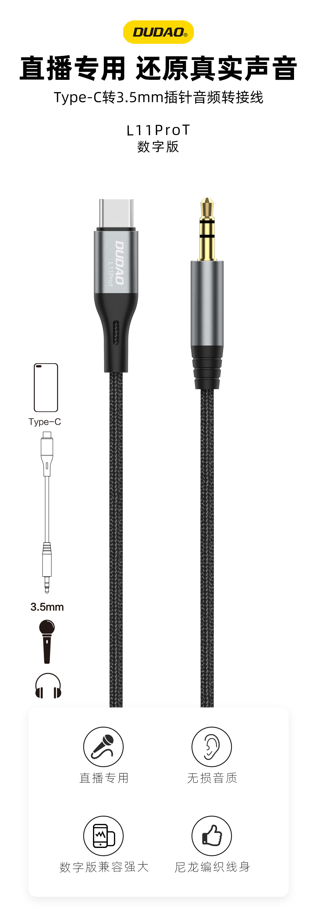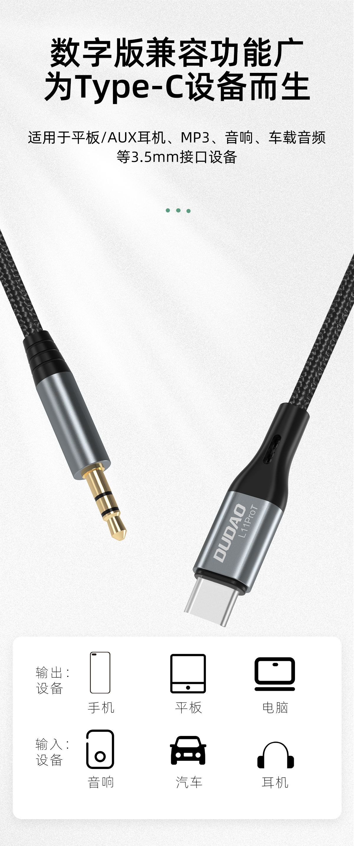 ·为Type-C设备而生,数字版兼容广,适用于平板、AUX耳机、MP3、音响、车载音频等3.5mm接口设备