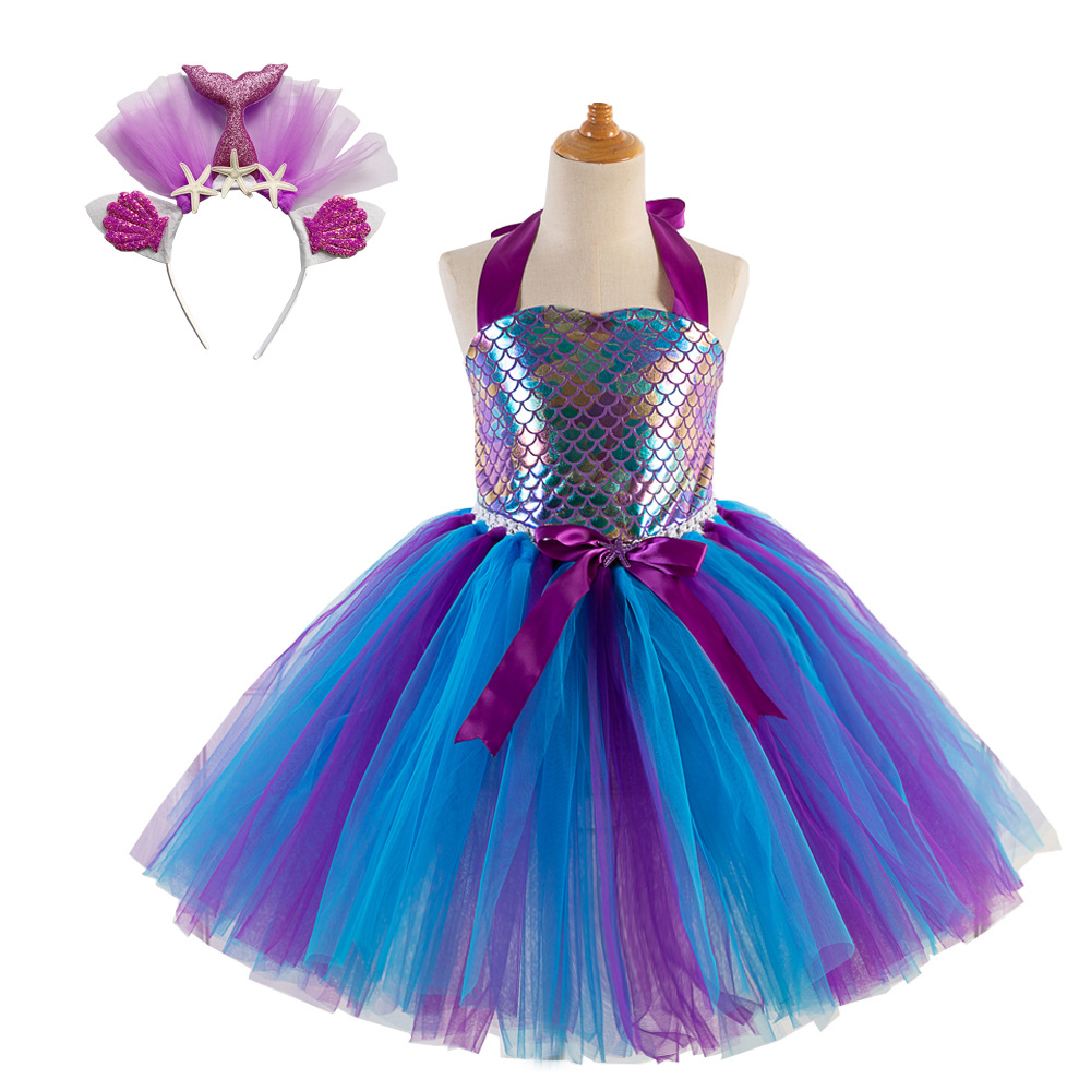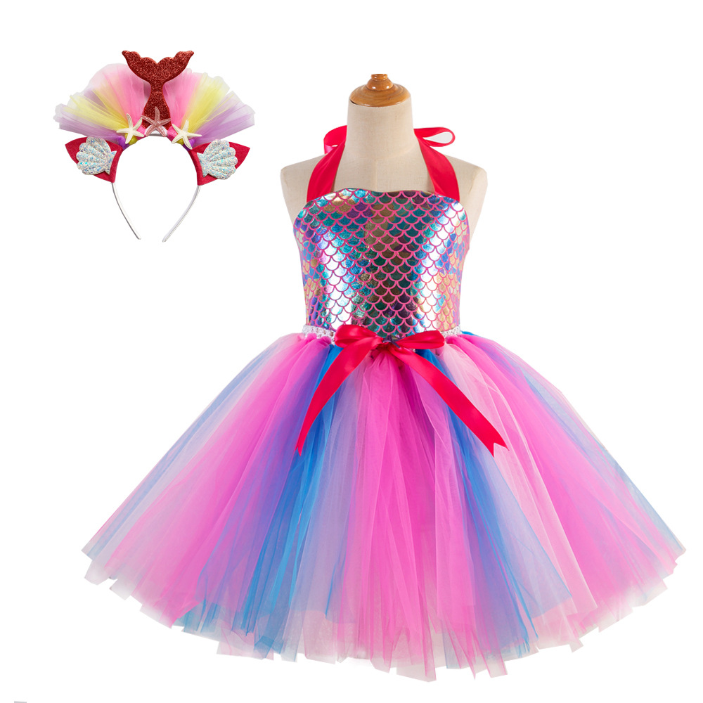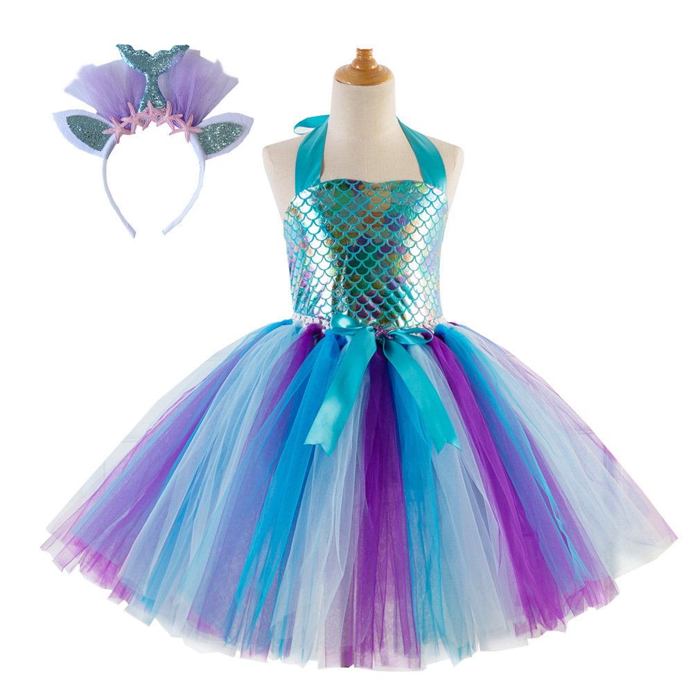 2025 크리스마스 유럽과 미국 아동복 인어 소녀 드레스 손으로 묶은 메쉬 코스프레 드레스와 머리 장식