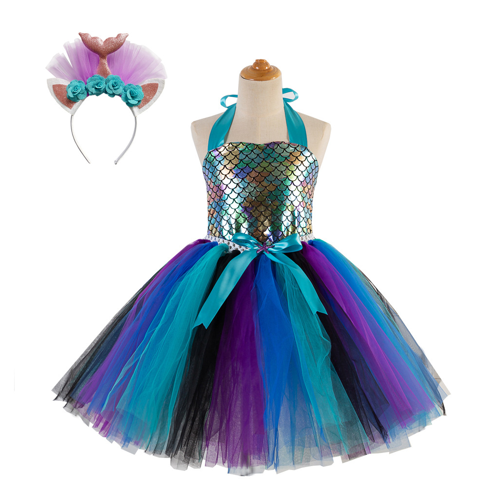• 欧美童装美人鱼送头饰女童蓬蓬裙cospaly表演连衣裙鱼鳞礼服裙