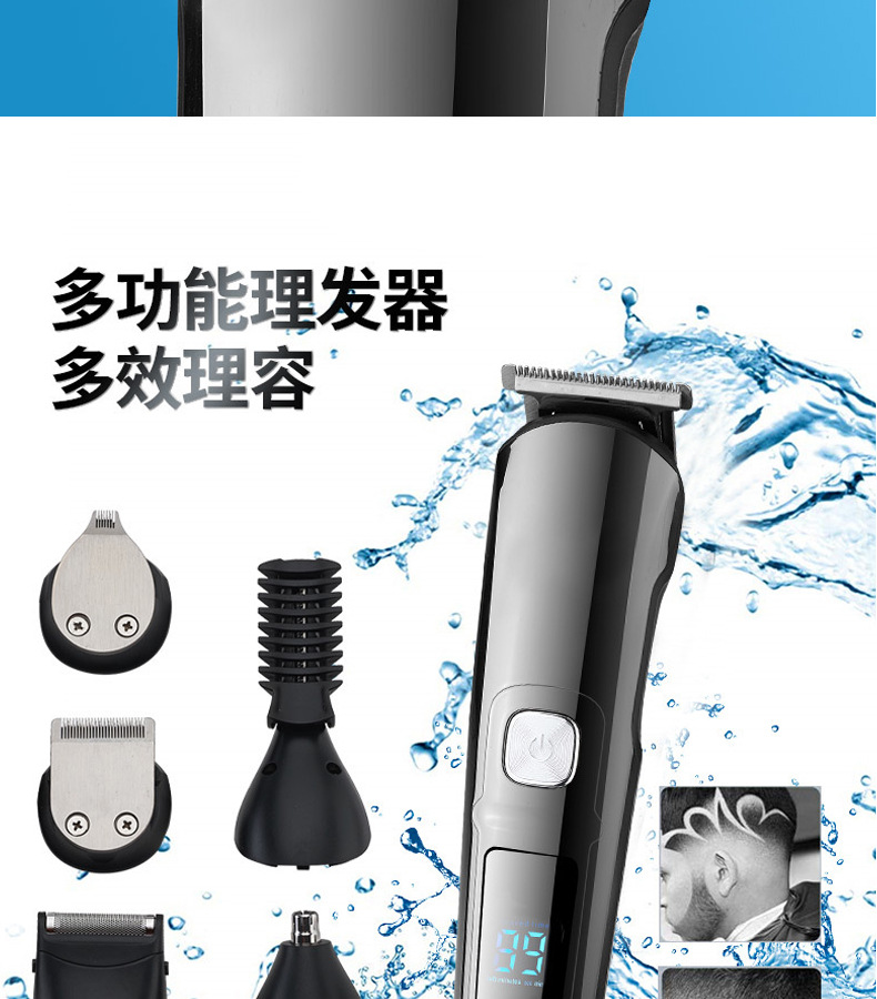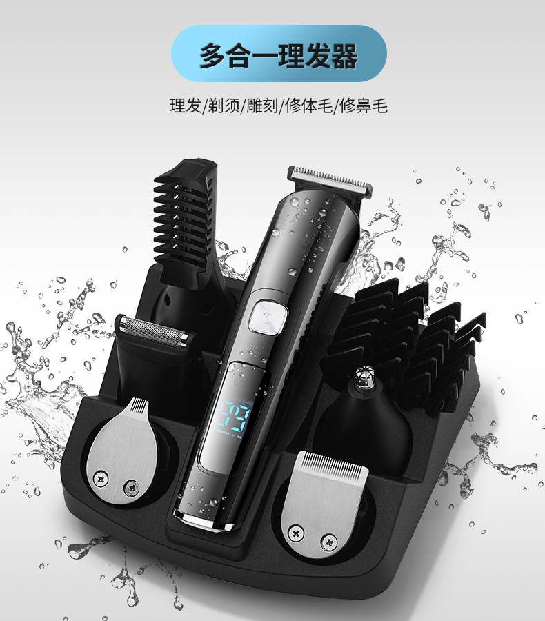基本配置:T型刀,U型刀,鼻毛修剪器,剃须刀,刻字刀,体毛刀,限位梳(3/6/9/12MM),USB线,外文说明书,清洁刷,润滑油,收纳盒,理发梳等