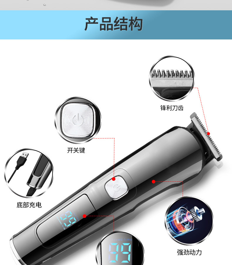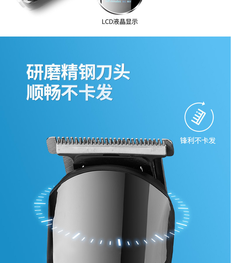 卖点:3秒上锁(旅行锁)、两档调速、全身水洗、液晶数字显示、多功能套装、含收纳底座、强劲动力、环保锂电池
