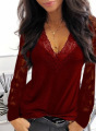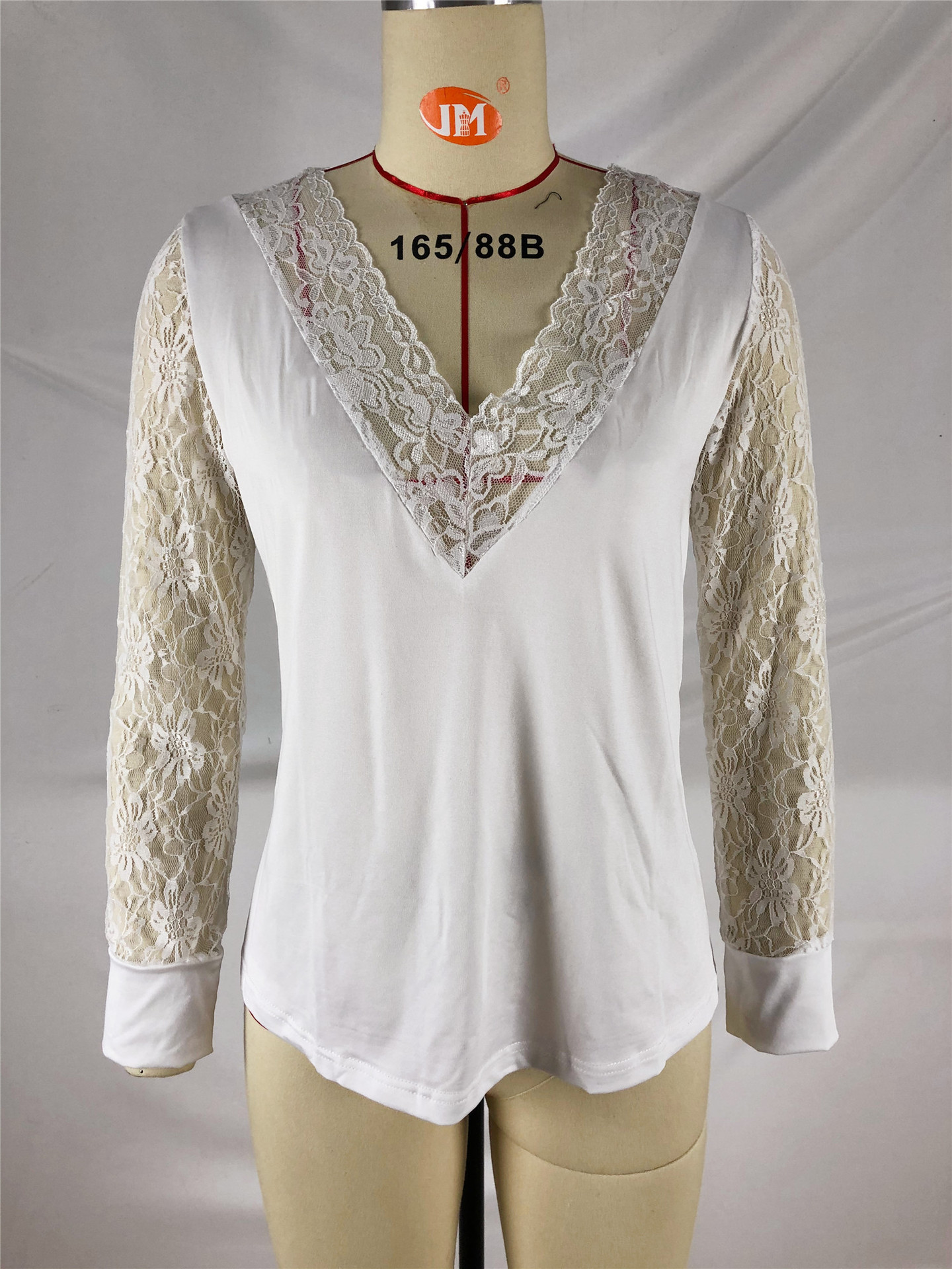 2024 가을 새로운 국경 대외 무역 유럽과 미국 의류 소스 레이스 스플 라이스 V 넥 시스루 긴팔 티셔츠