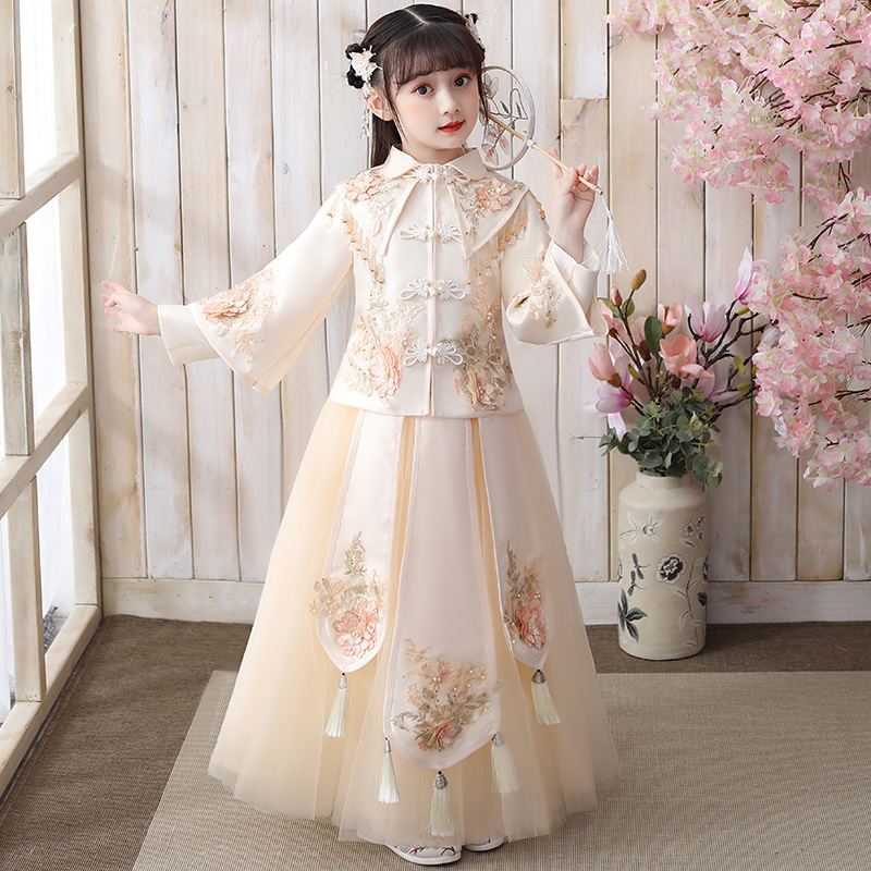 中国风女童汉服新款儿童古装春秋唐装交领粉色古风超仙小女孩长袖