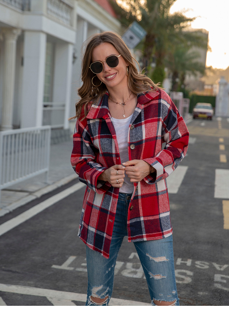 인터넷 연예인 가을 거리 우아한 유럽과 미국의 긴팔 옷깃 느슨한 여성용 격자 무늬 셔츠 중간 길이 재킷